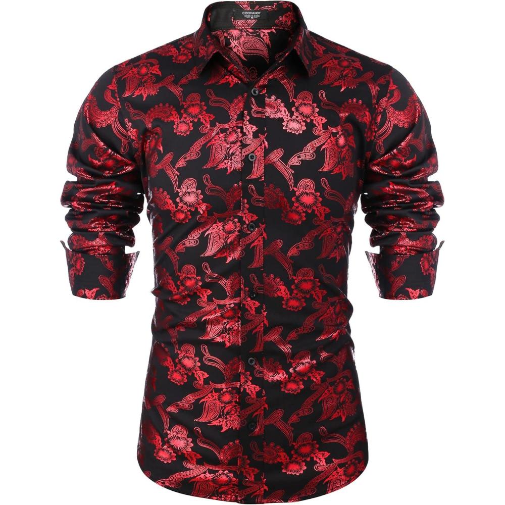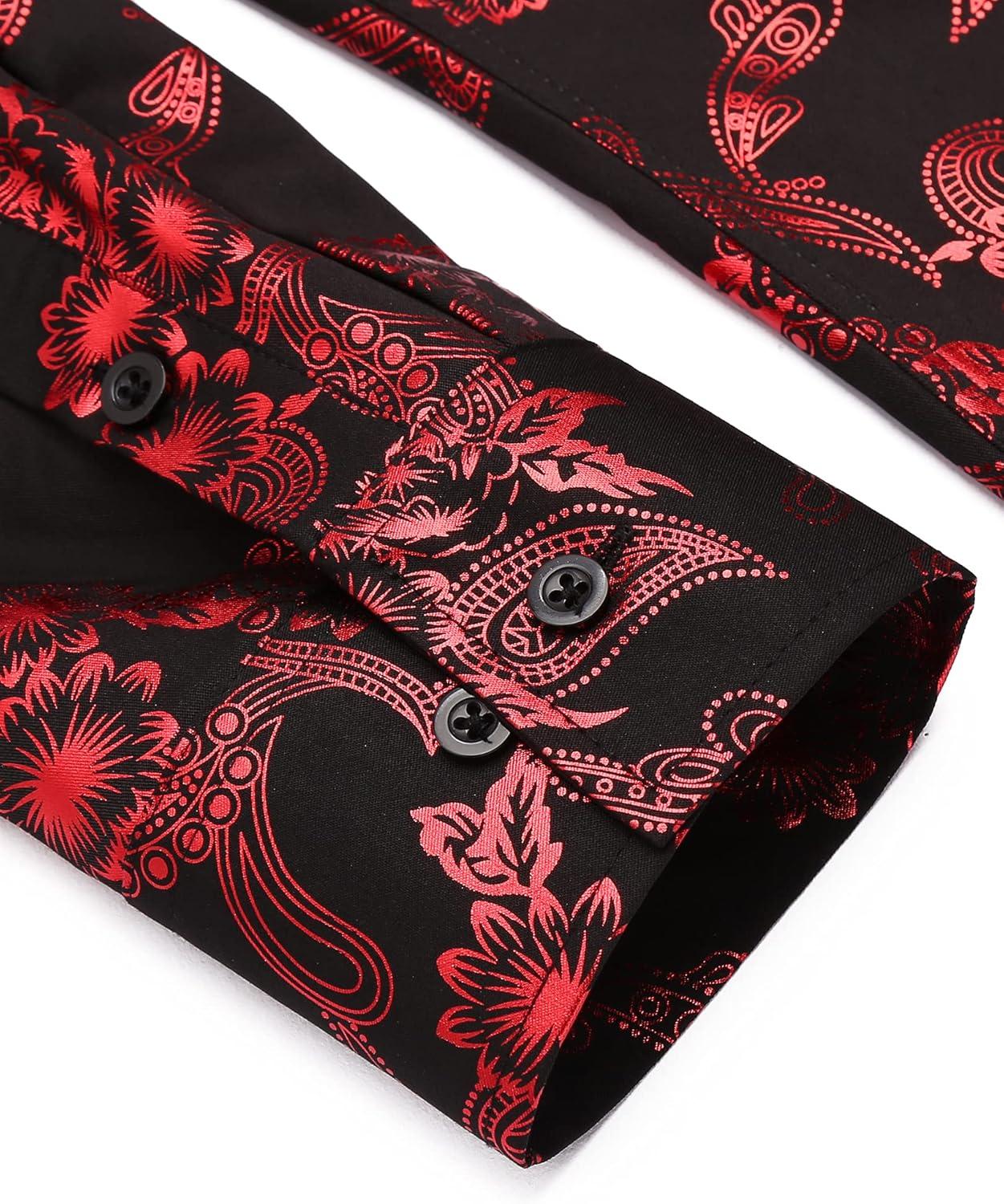 COOFANDY Men’s Silk Satin Dress Shirts Jacquard Long Sleeve Floral Button Up Shirts Party Prom Wedding Shirt(Paisley-red)