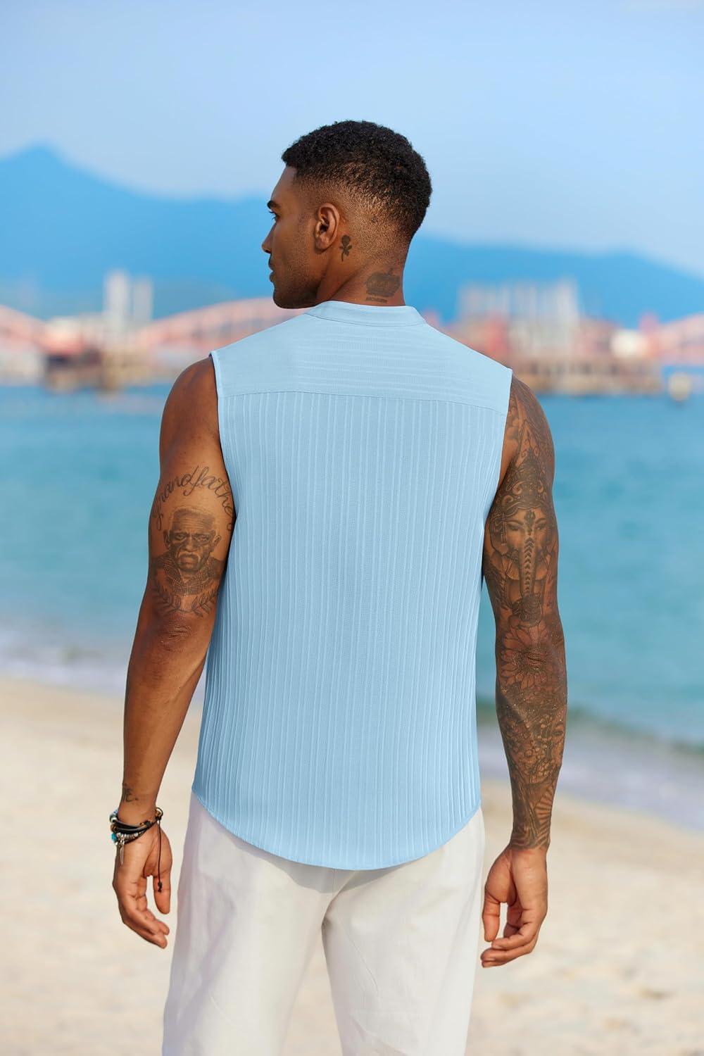 COOFANDY Mens Sleeveless Summer Shirts Beach Tank Tops Button Up Textured Tank Shirt for Vacation(Light Blue)