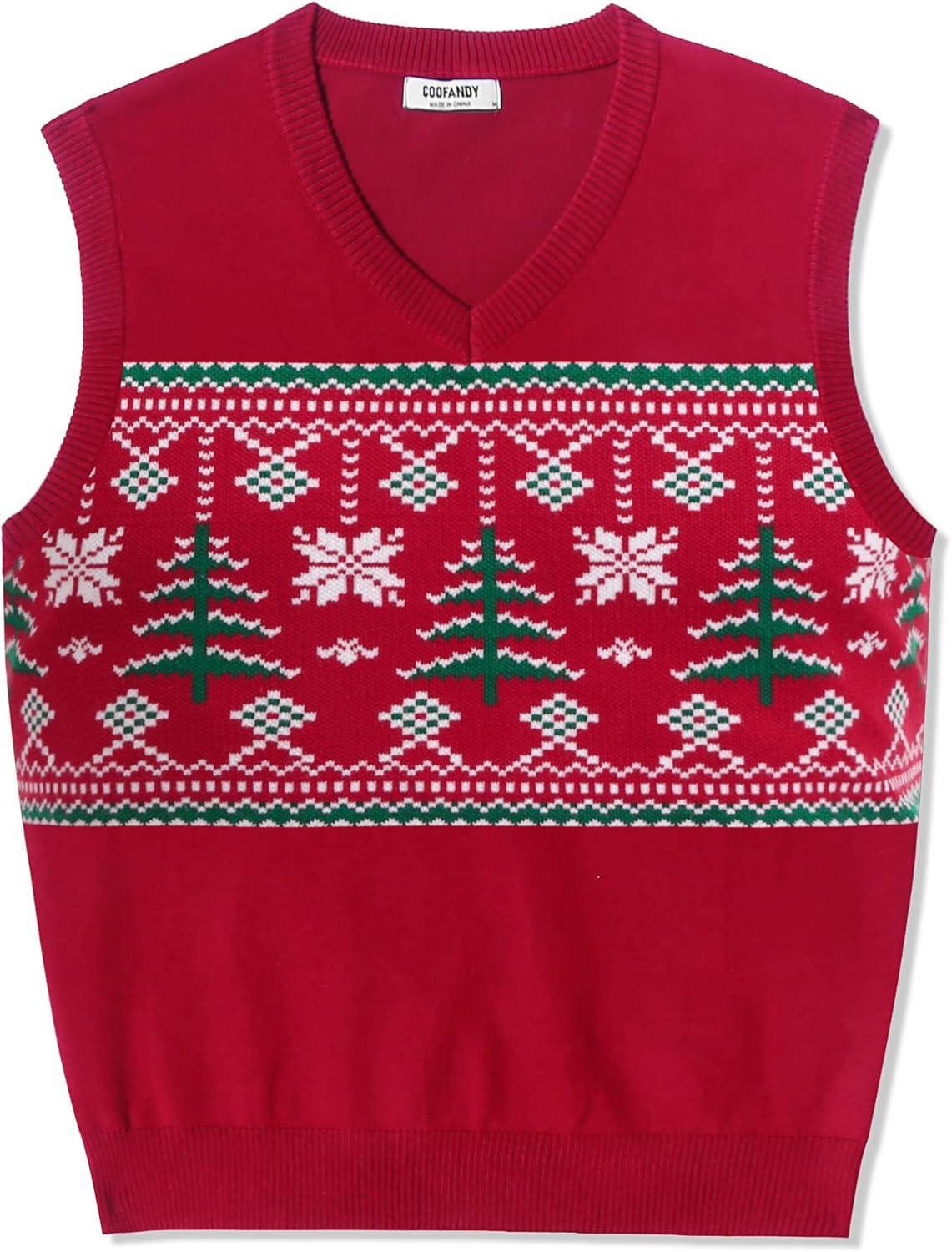 COOFANDY Men’s Sleeveless Sweater Vest Lightweight V-Neck Cotton Vest Pullover(Christmas Tree – Red)