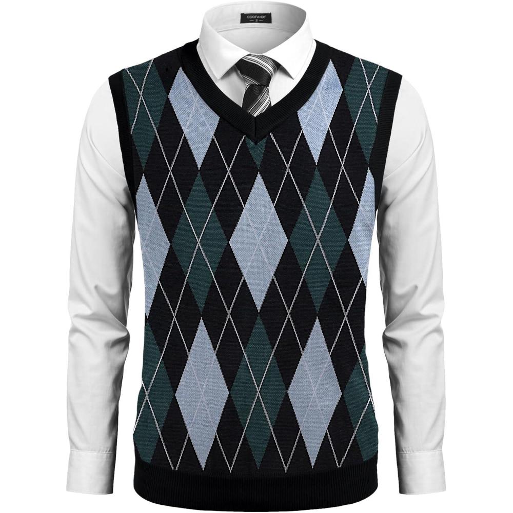 COOFANDY Men’s Sleeveless V Neck Pullover Sweater Slim Fit Casual Argyle Vest Sweaters(Blue-green)