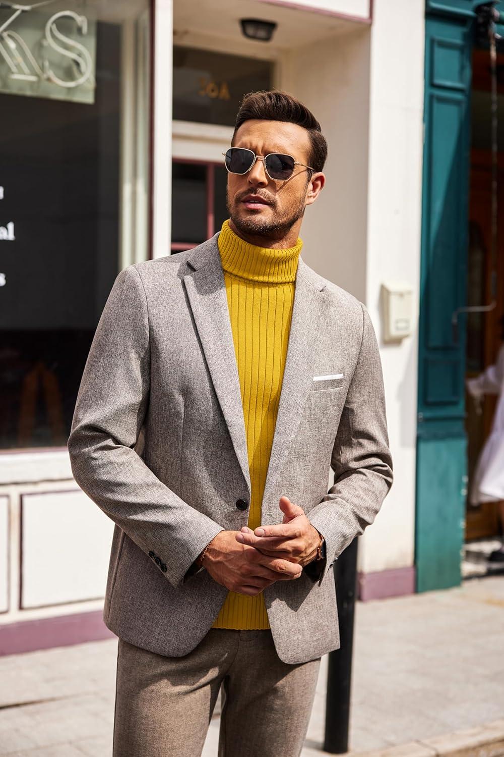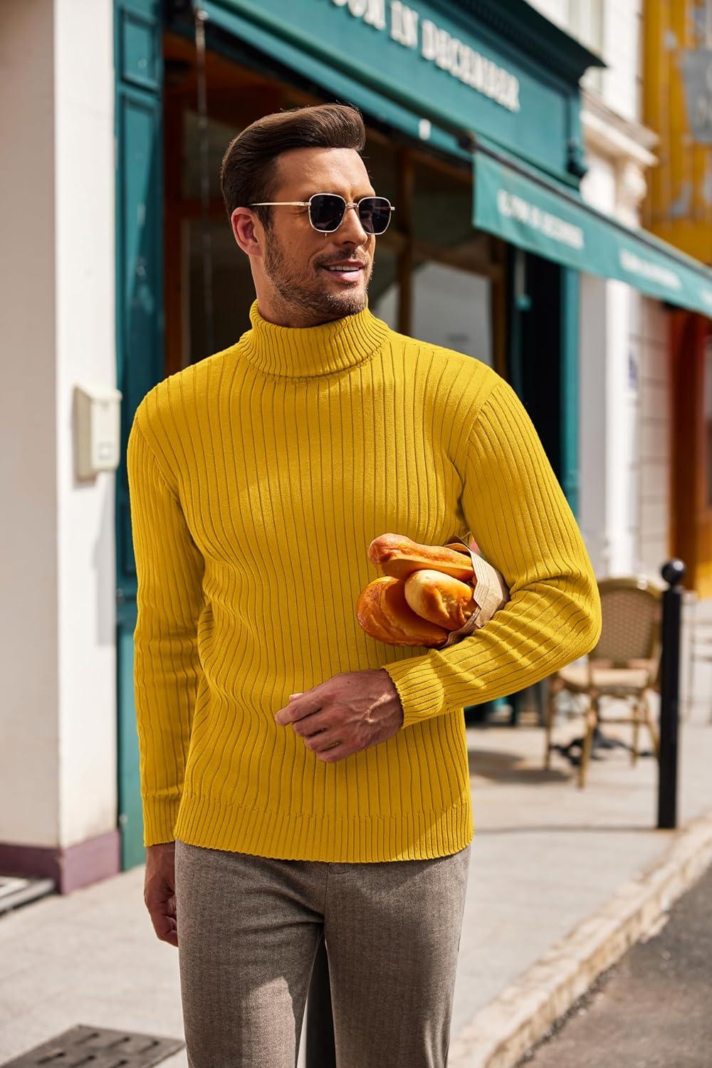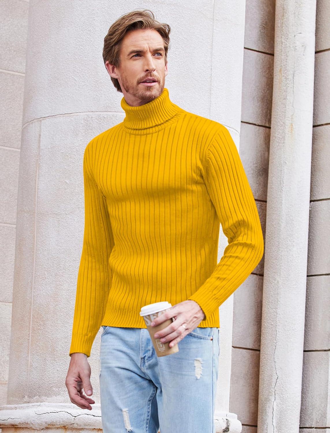 COOFANDY Men’s Slim Fit Turtleneck Sweater Casual Pullover Sweater Lightweight Ribbed Sweater(Yellow)