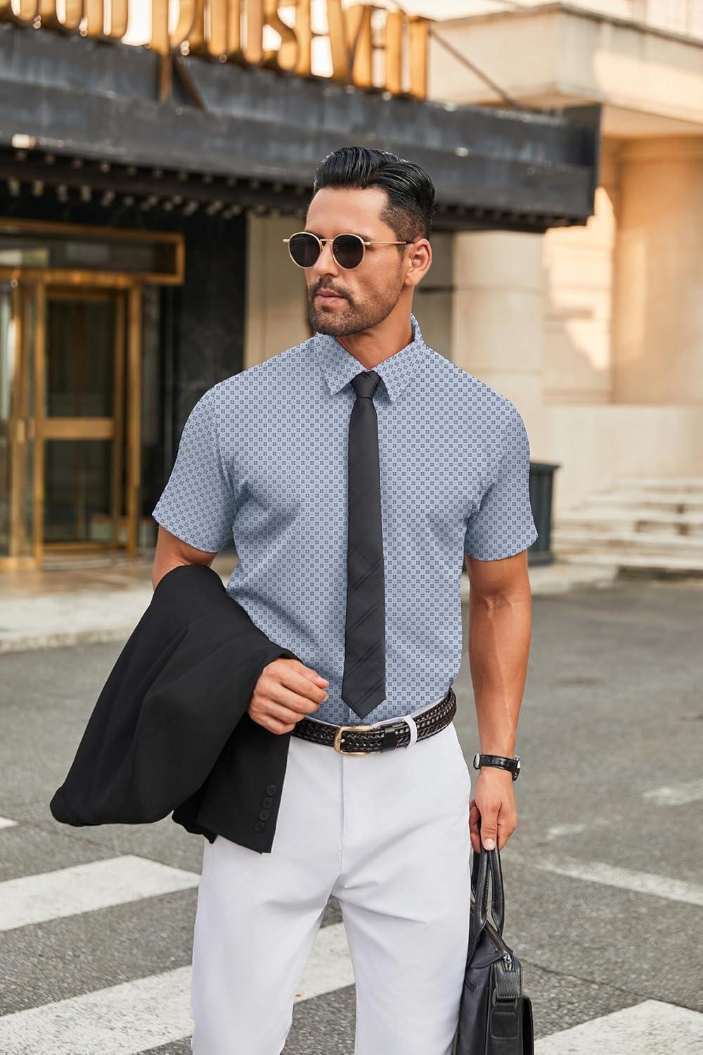 COOFANDY Men’s Stretch Dress Shirts Short Sleeve Wrinkle Free Casual Button Down Shirts(Blue Pattern)