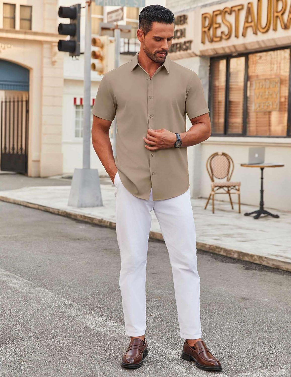 COOFANDY Men’s Stretch Dress Shirts Short Sleeve Wrinkle Free Casual Button Down Shirts(Khaki)