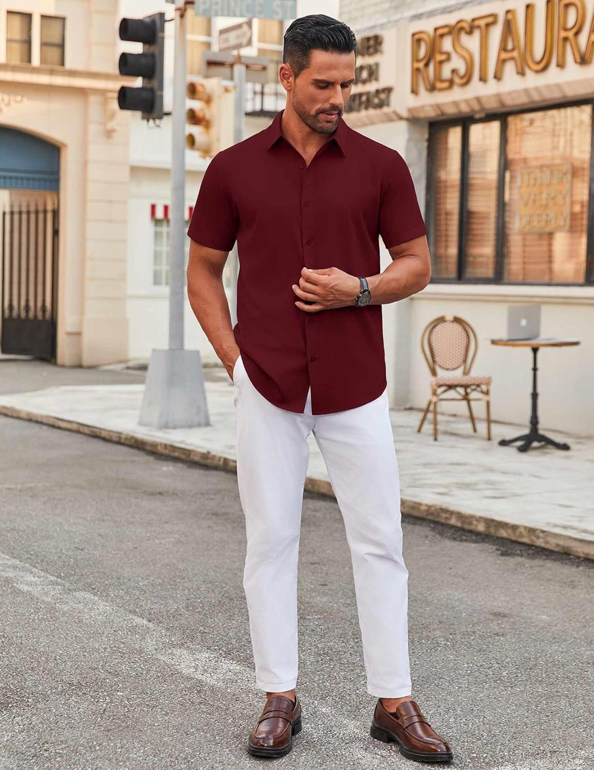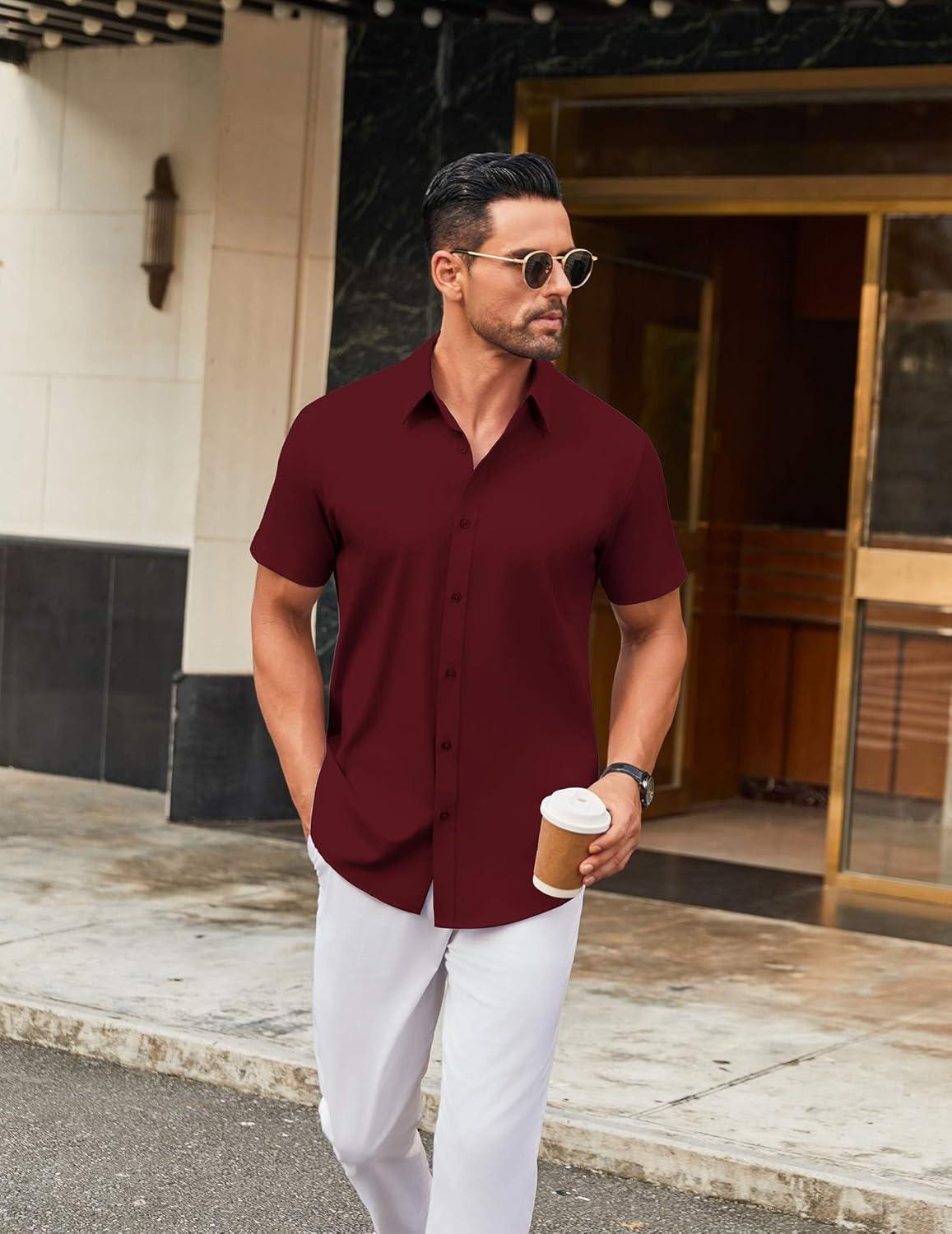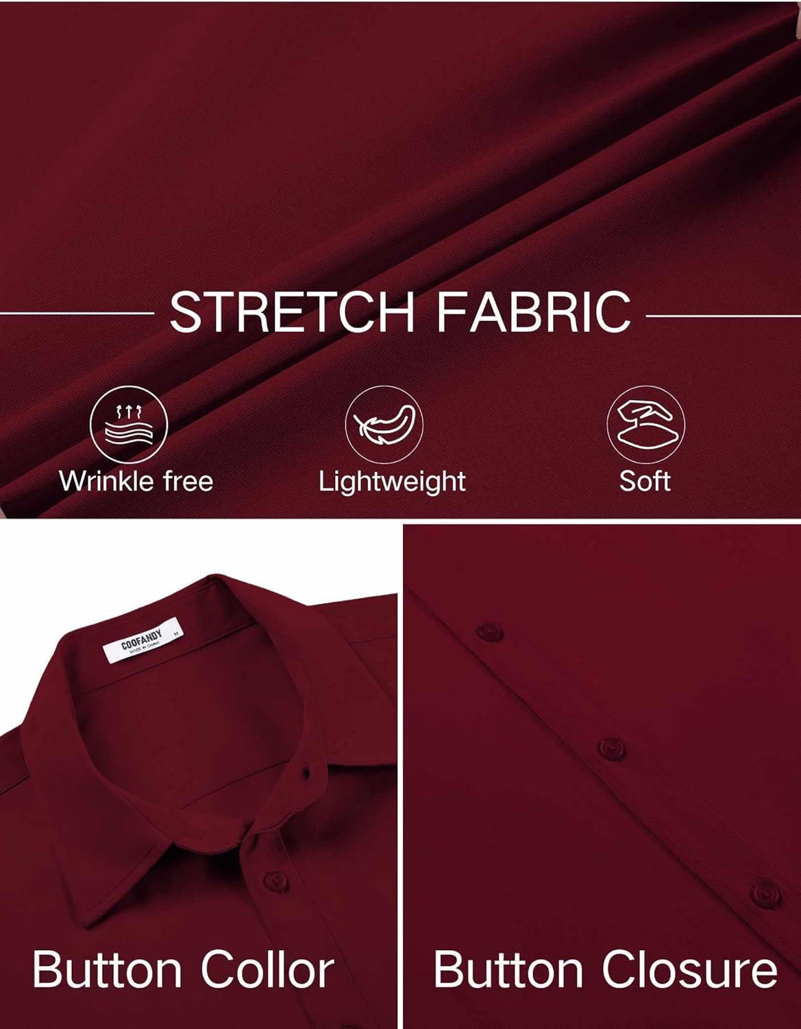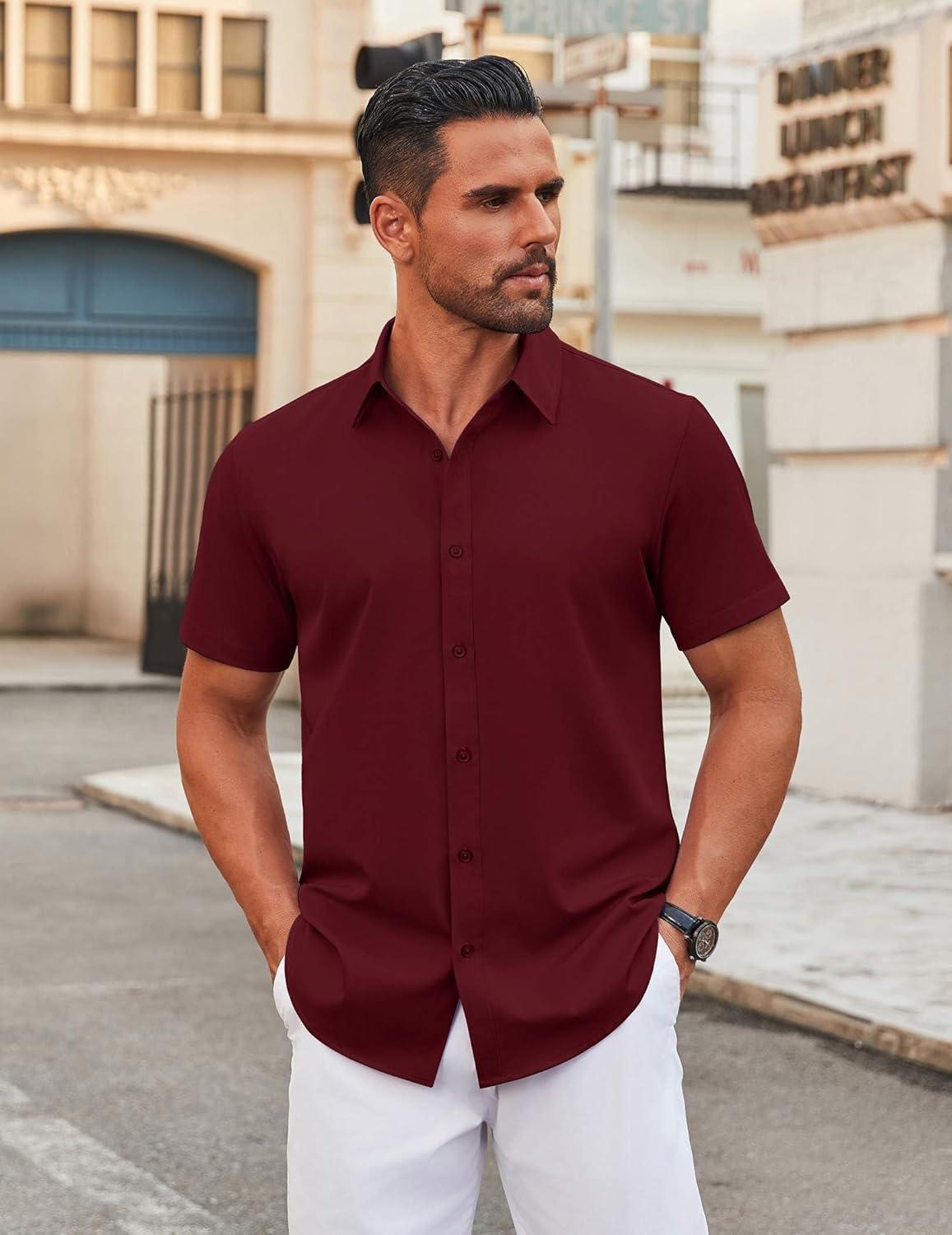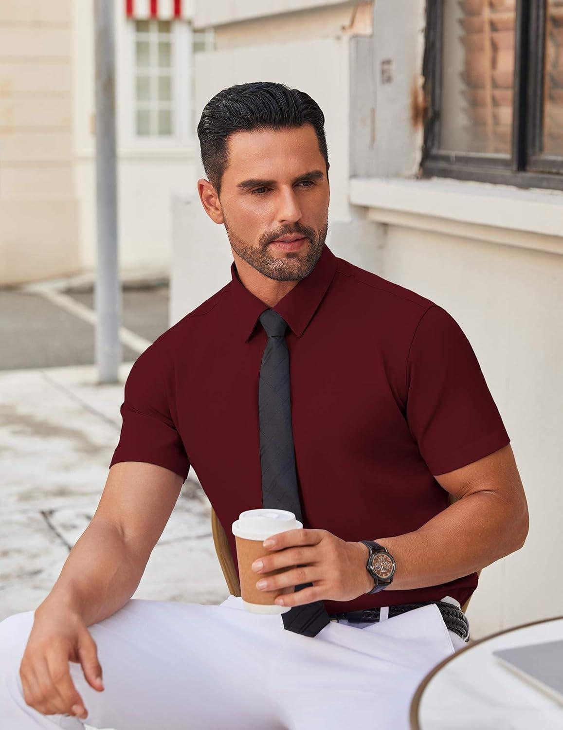 COOFANDY Men’s Stretch Dress Shirts Short Sleeve Wrinkle Free Casual Button Down Shirts(Wine Red)