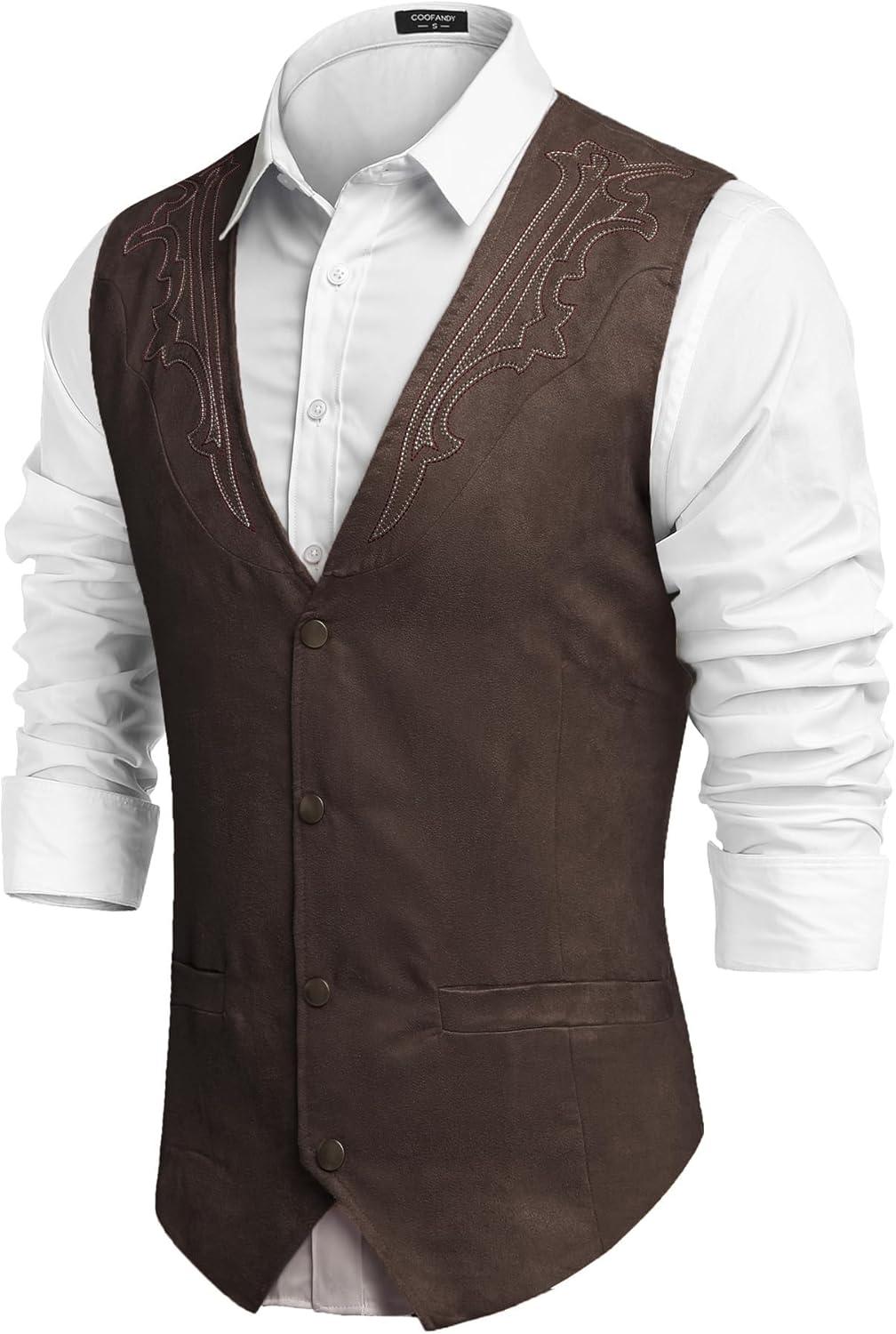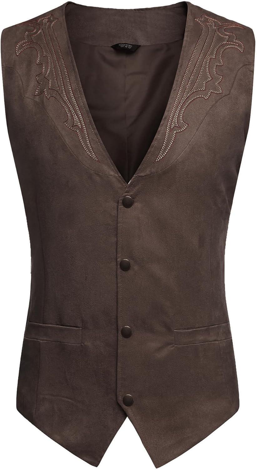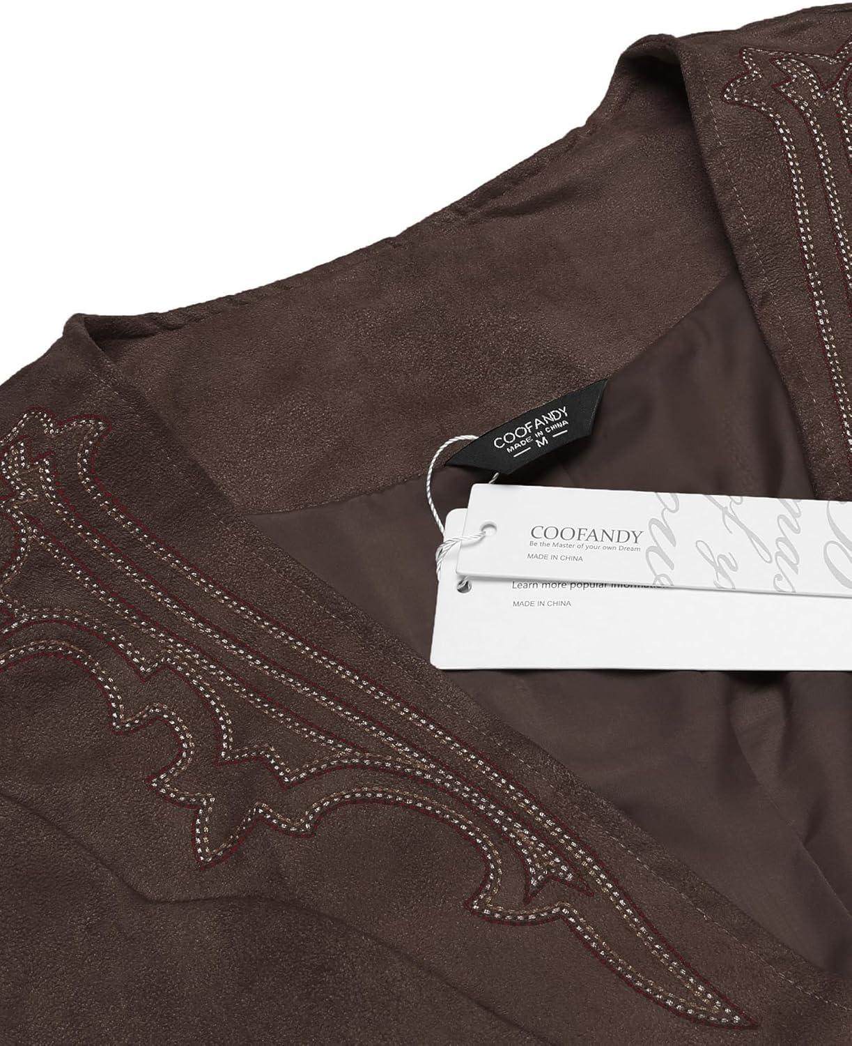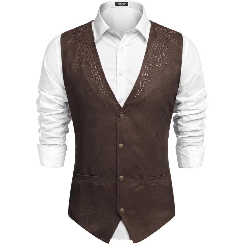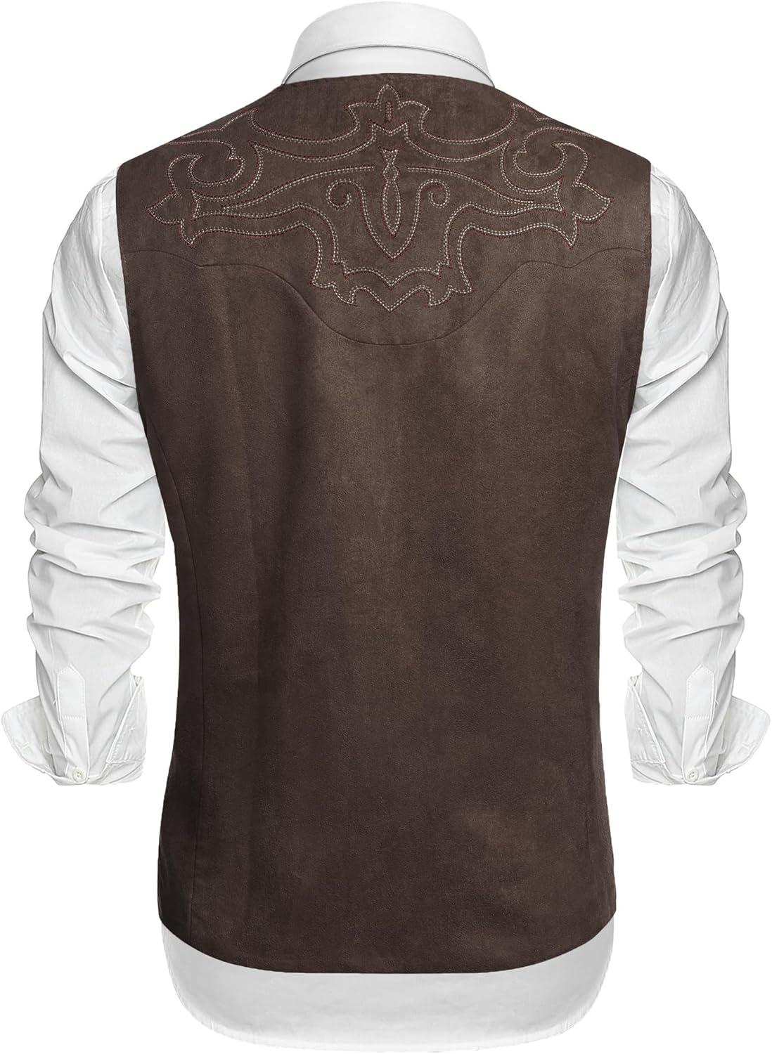 COOFANDY Men’s Suede Leather Vest Cowboy Western Waistcoat Casual Slim Fit Suit Vest(Coffee (With Pattern))