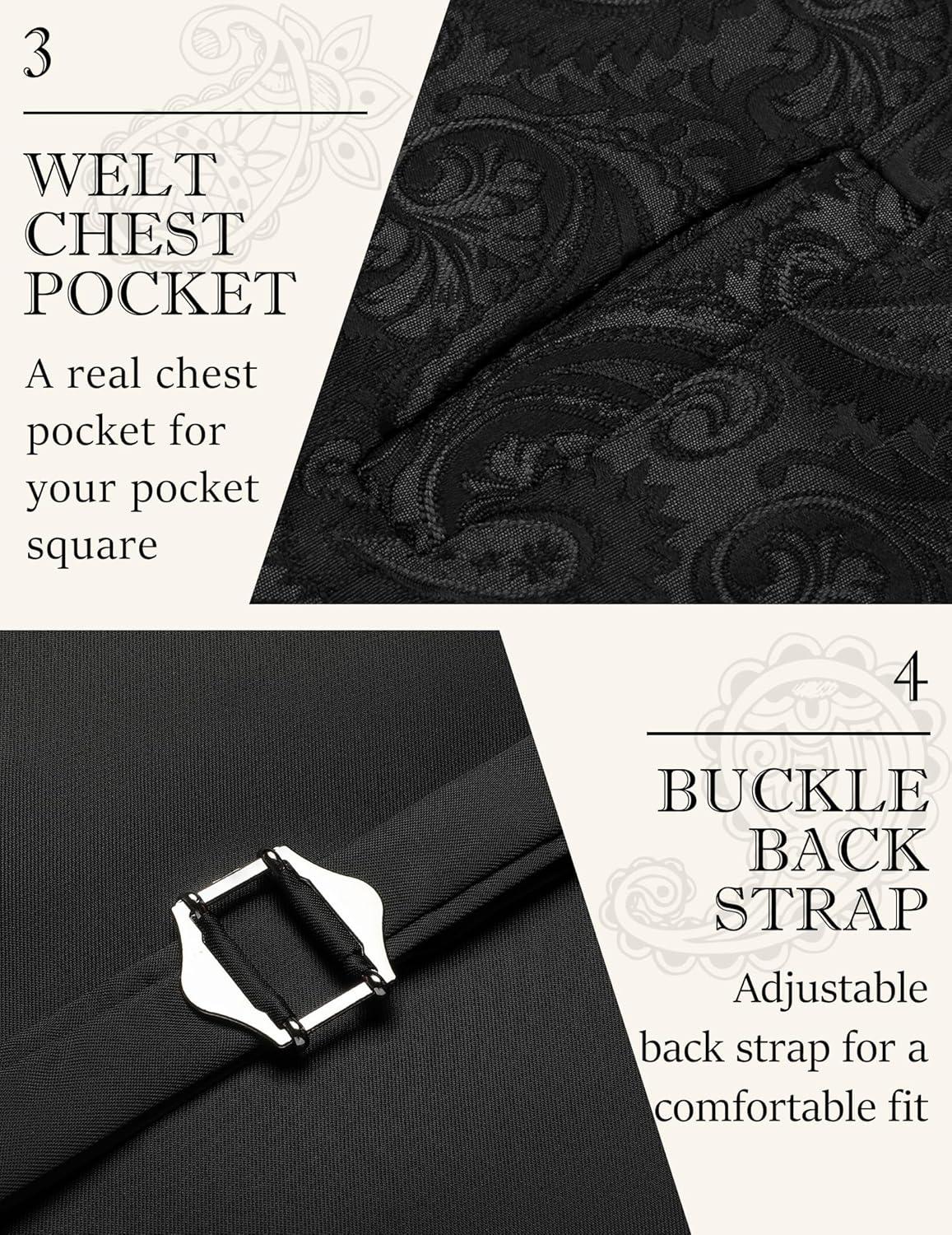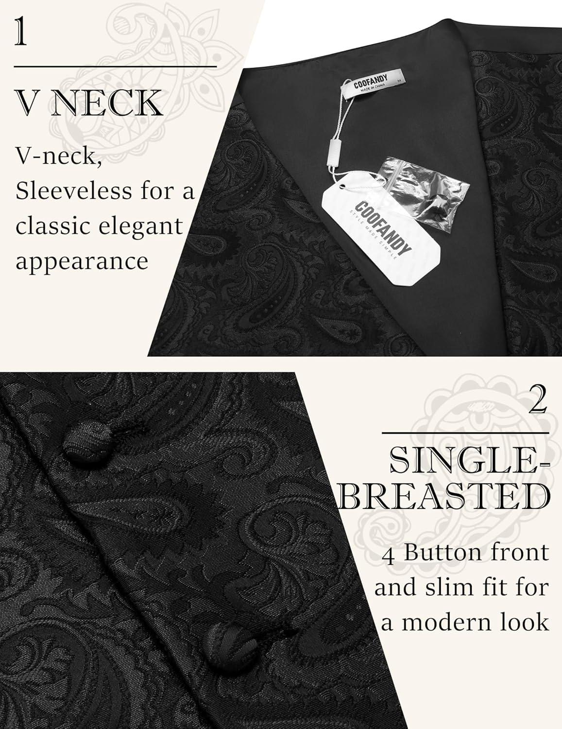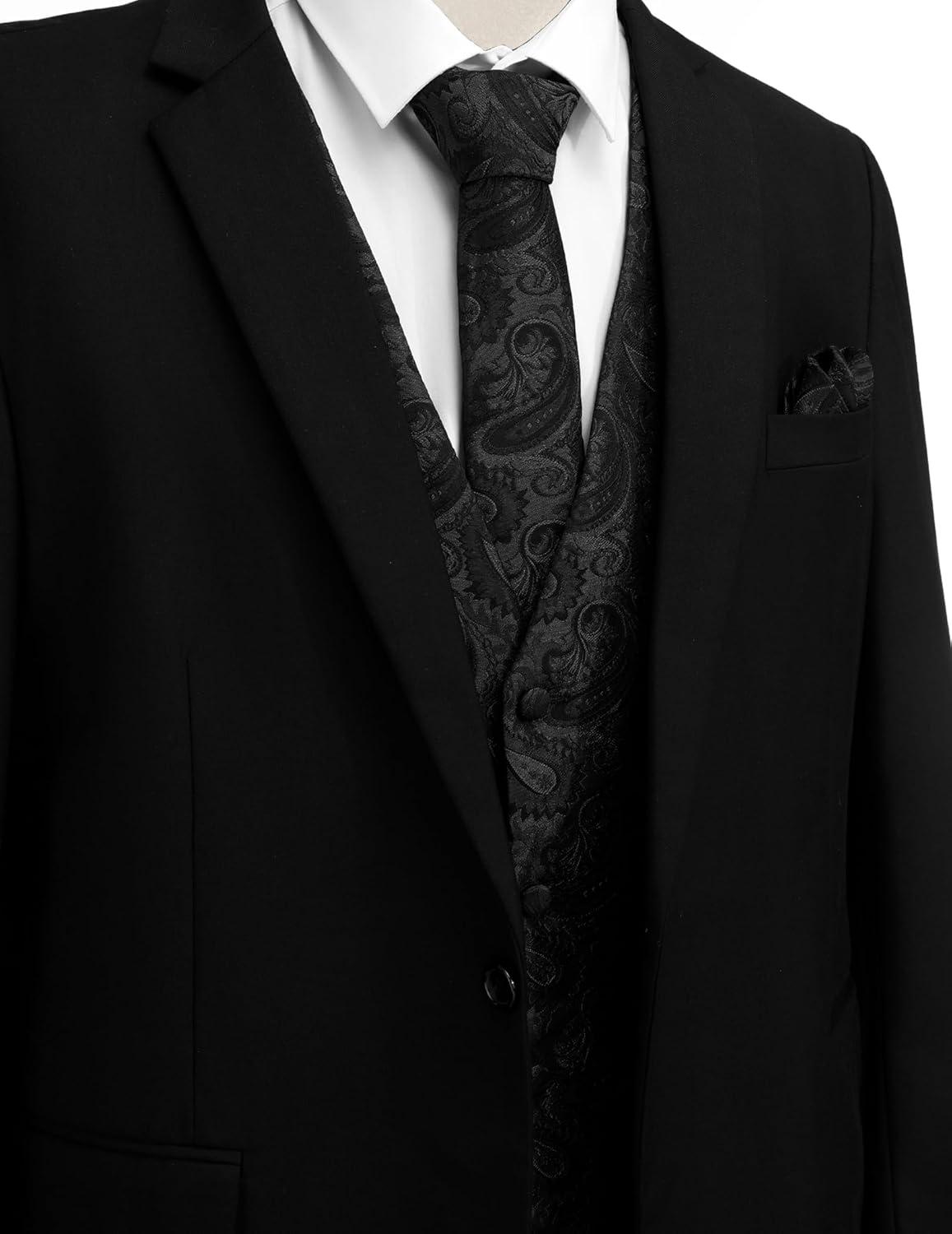 COOFANDY Men’s Suit Vest Tie Set 3PC Paisley Jacquard Waistcoat and Necktie Pocket Square for Holiday Party Wedding(Black Paisley)