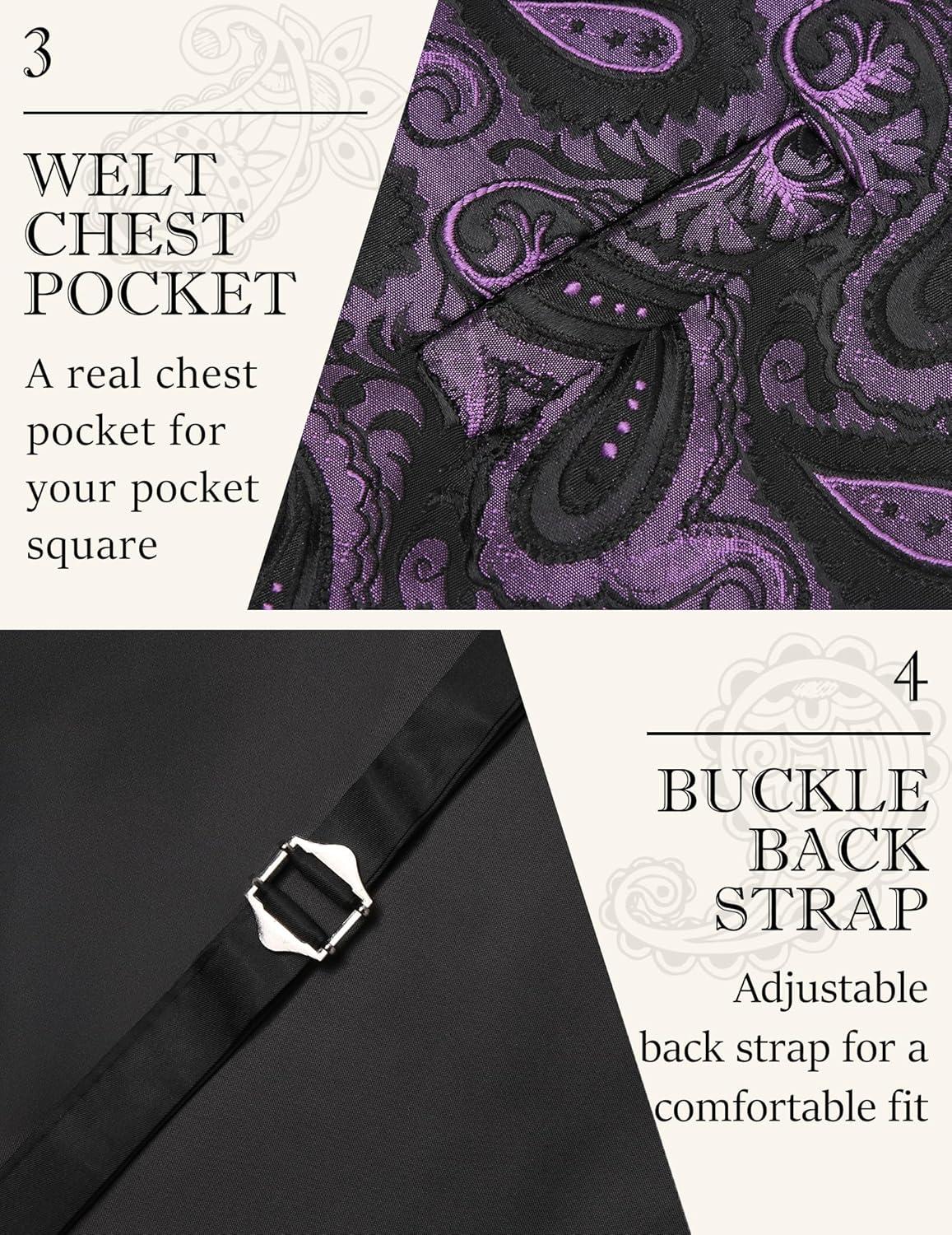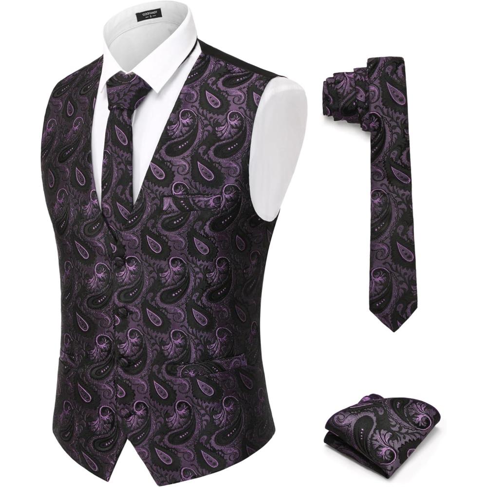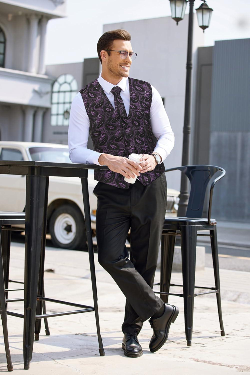 COOFANDY Men’s Suit Vest Tie Set 3PC Paisley Jacquard Waistcoat and Necktie Pocket Square for Holiday Party Wedding(Purple Paisley)