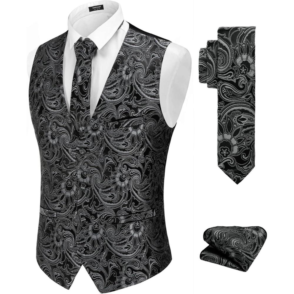 COOFANDY Men’s Suit Vest Tie Set 3PC Paisley Jacquard Waistcoat and Necktie Pocket Square for Holiday Party Wedding(Silver)