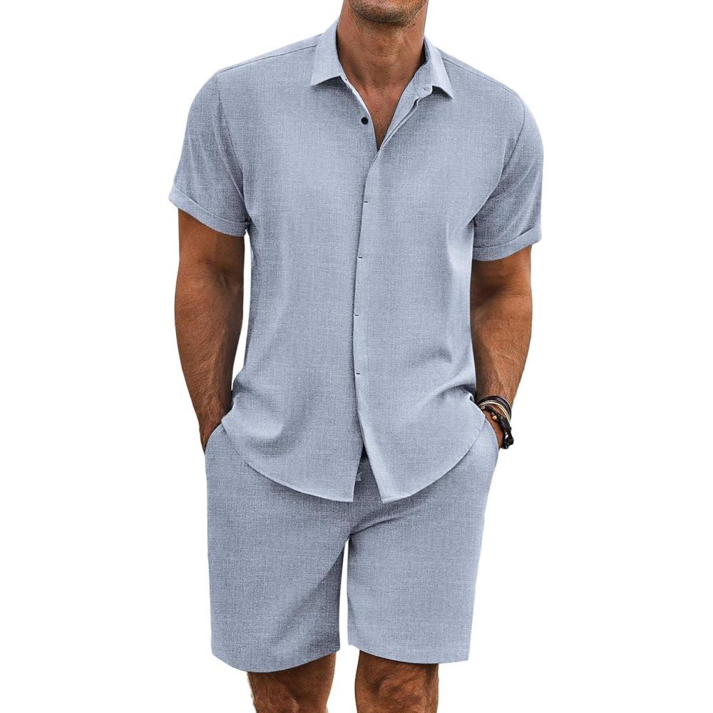 COOFANDY Men’s Summer Beach Outfits 2 Piece Short Sleeve Shirts and Shorts Vacation Texture Linen Sets for Men(Blue)