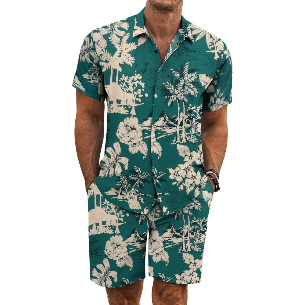 COOFANDY Men’s Summer Beach Outfits 2 Piece Short Sleeve Shirts and Shorts Vacation Texture Linen Sets for Men(Coconut Tree-green)
