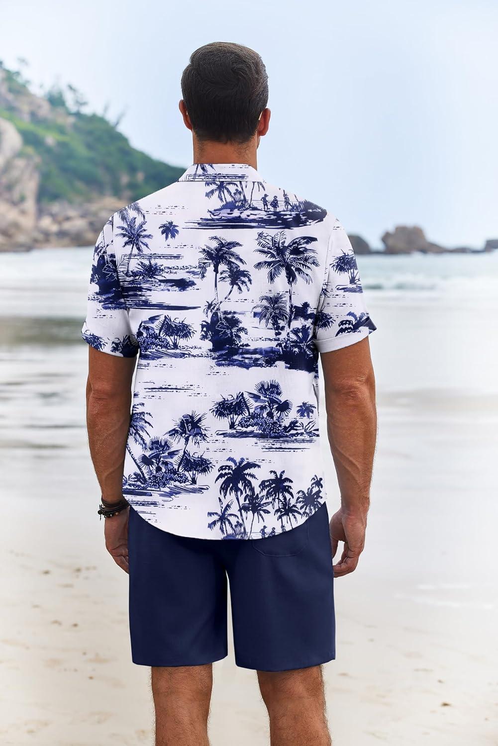 COOFANDY Men’s Summer Beach Outfits 2 Piece Short Sleeve Shirts and Shorts Vacation Texture Linen Sets for Men(Coconut Tree-white)