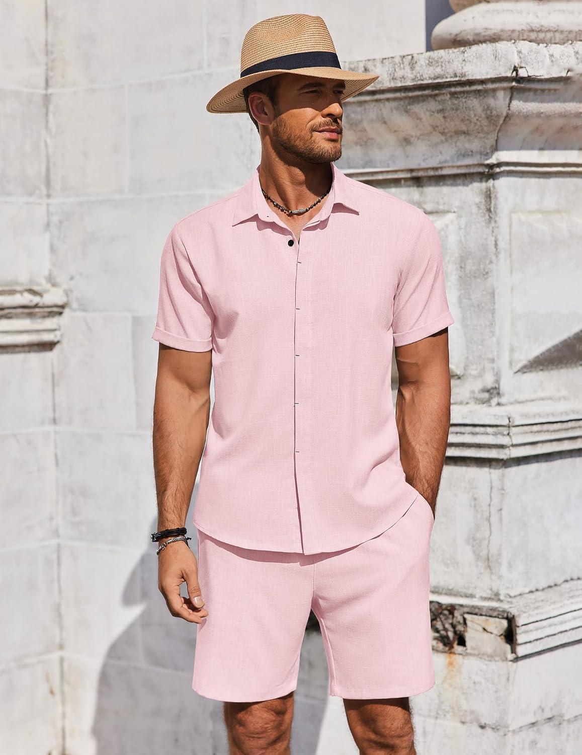 COOFANDY Men’s Summer Beach Outfits 2 Piece Short Sleeve Shirts and Shorts Vacation Texture Linen Sets for Men(Pink)