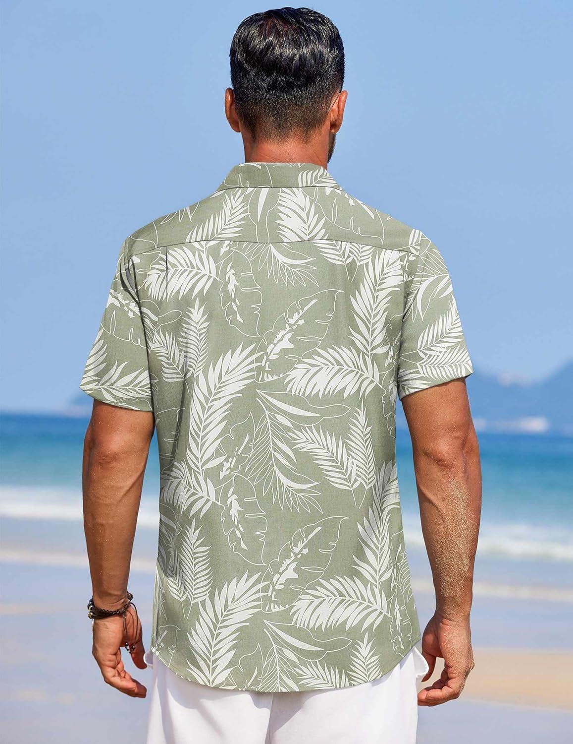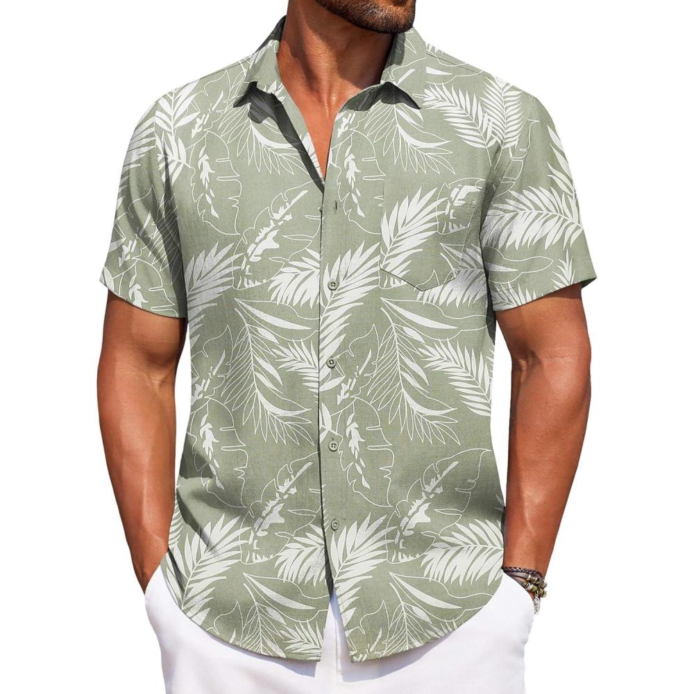 COOFANDY Men’s Summer Beach Vacation Shirt Casual Button Down Short Sleeve Shirt Hawaiian Tropical Resort Wear(Silhouette Leaves-grey Green)