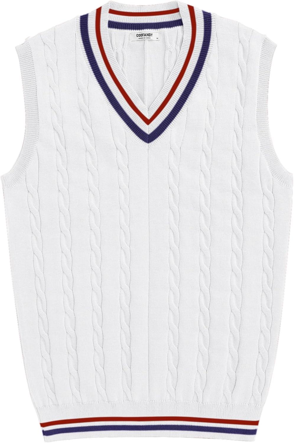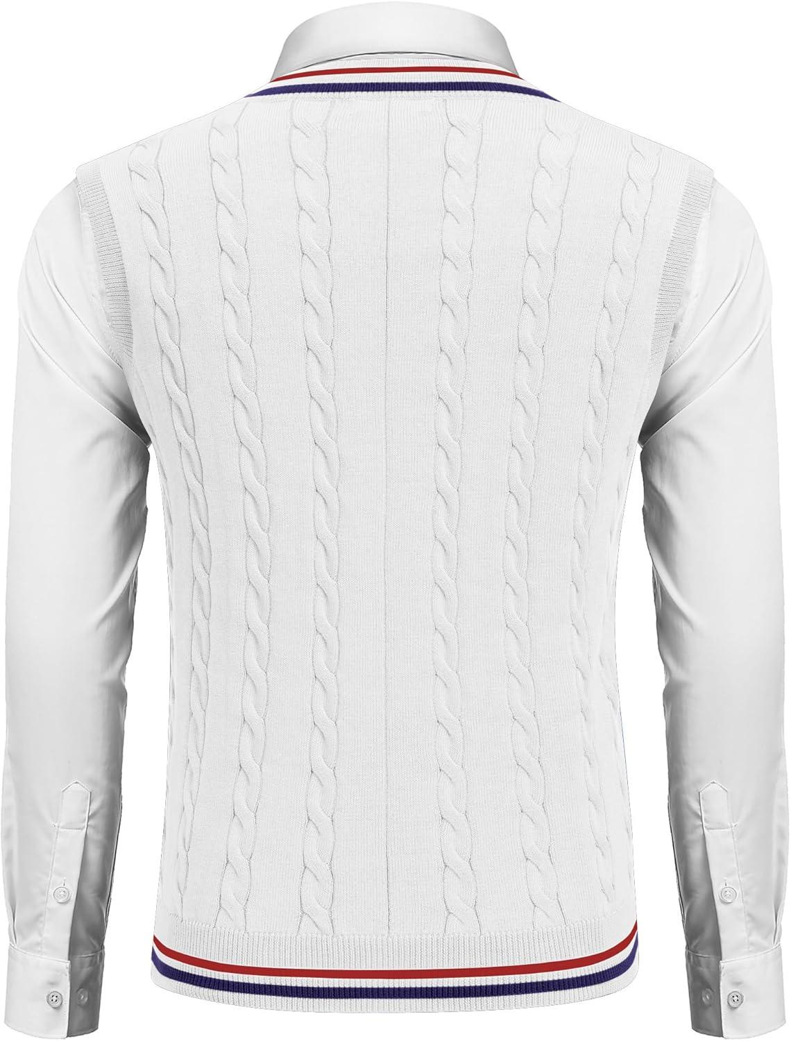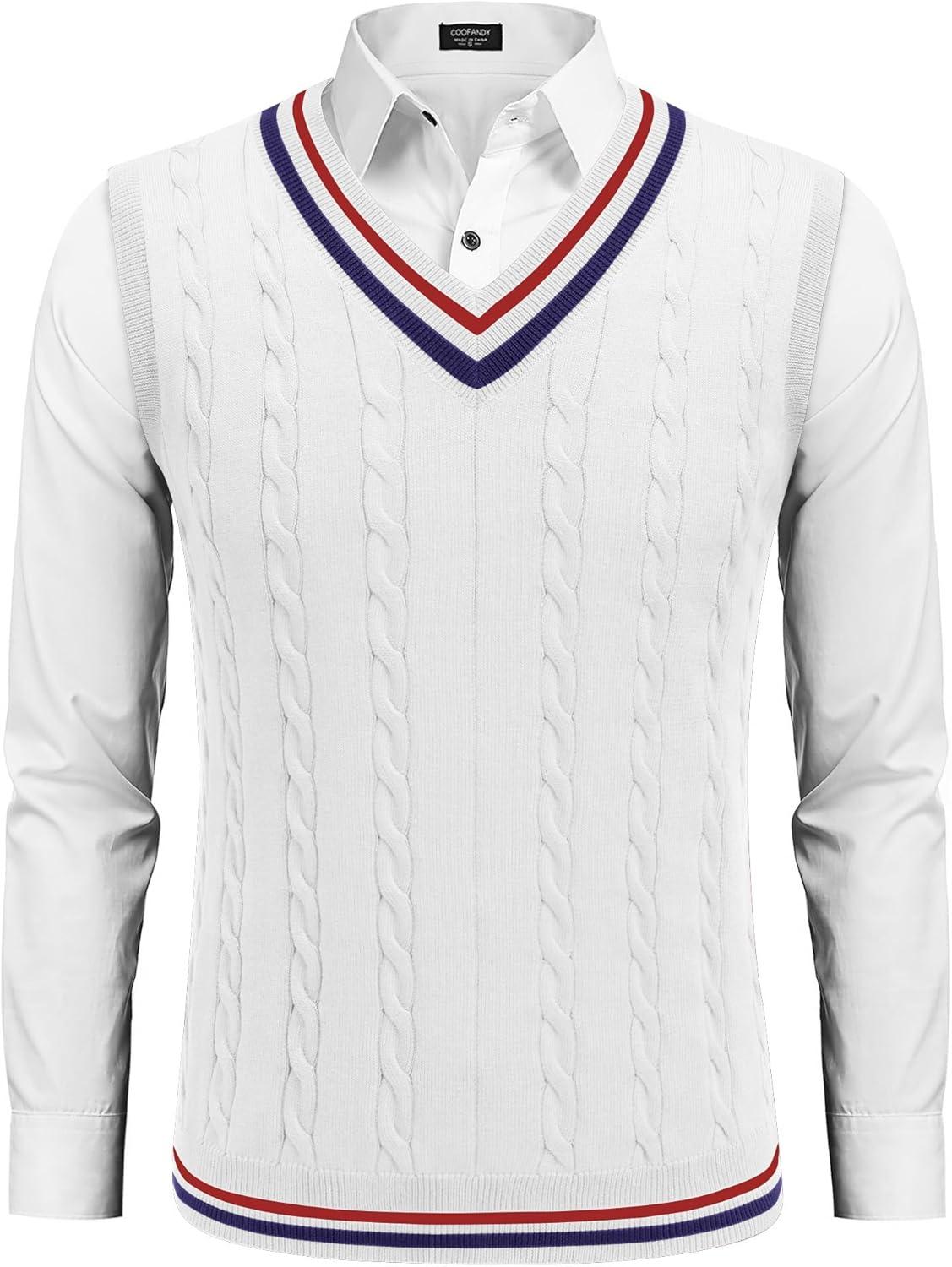 COOFANDY Men’s Sweater Vest V Neck Casual Sleeveless Pullover Striped Cable Knit Sweater Vest(All White)