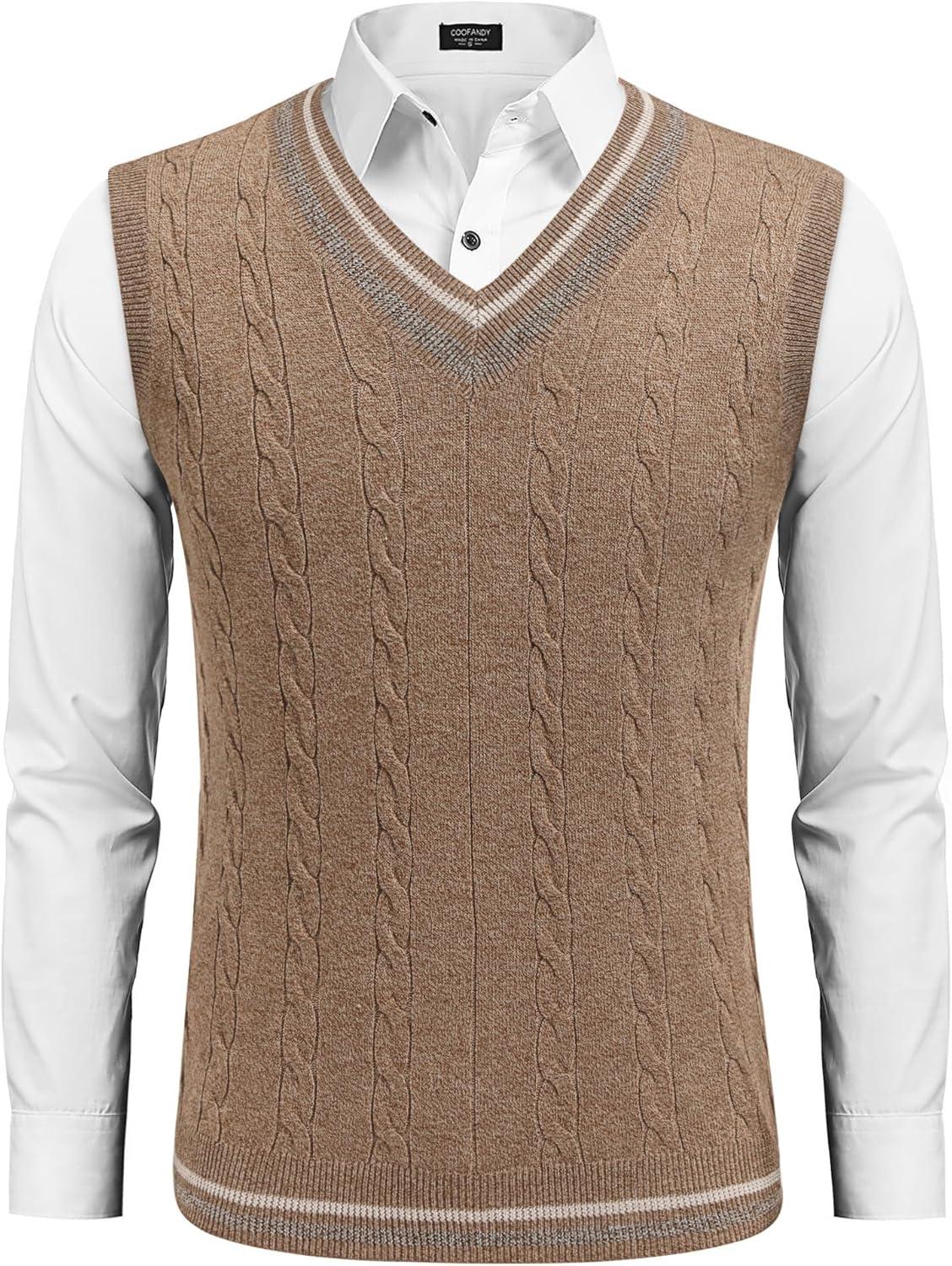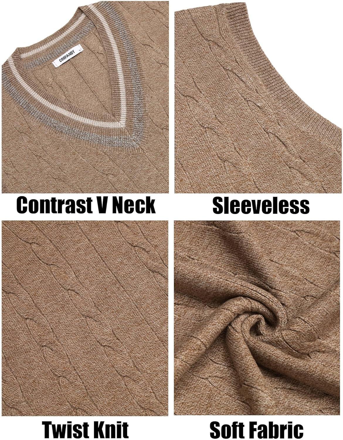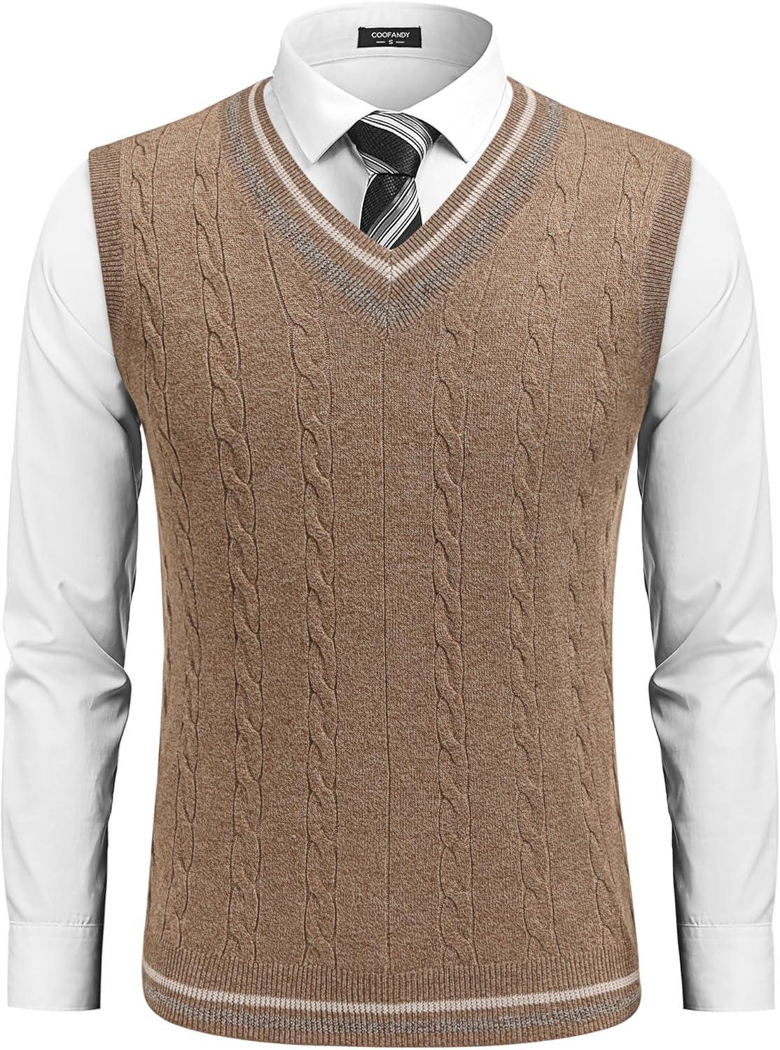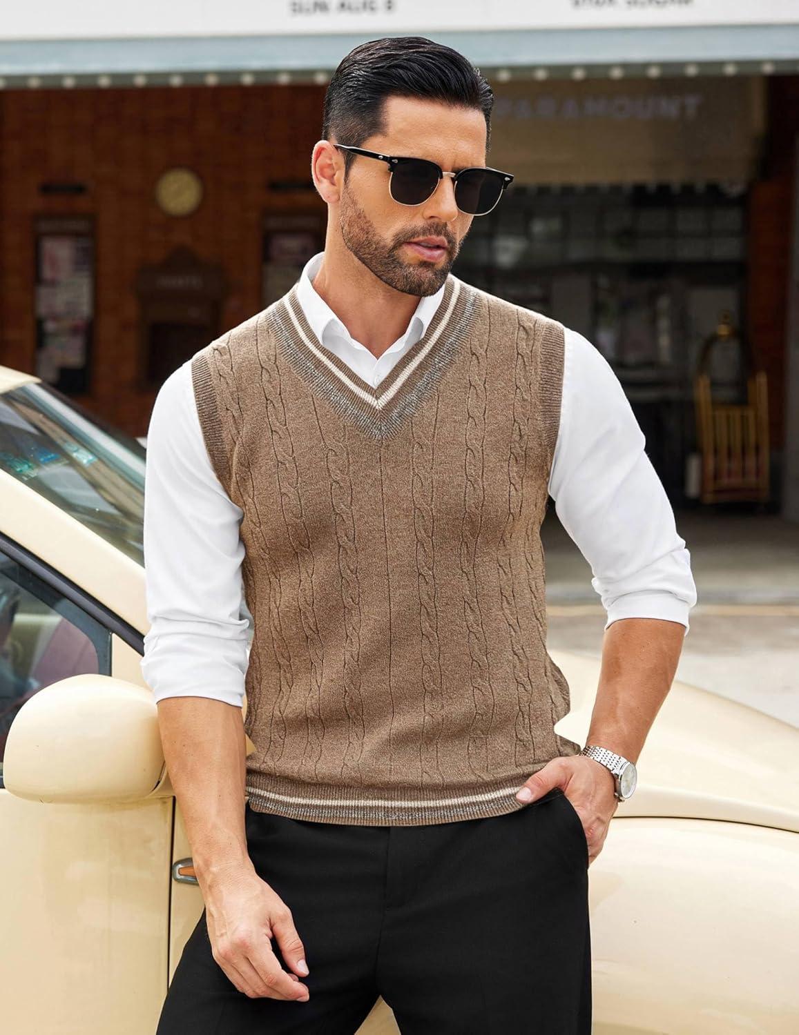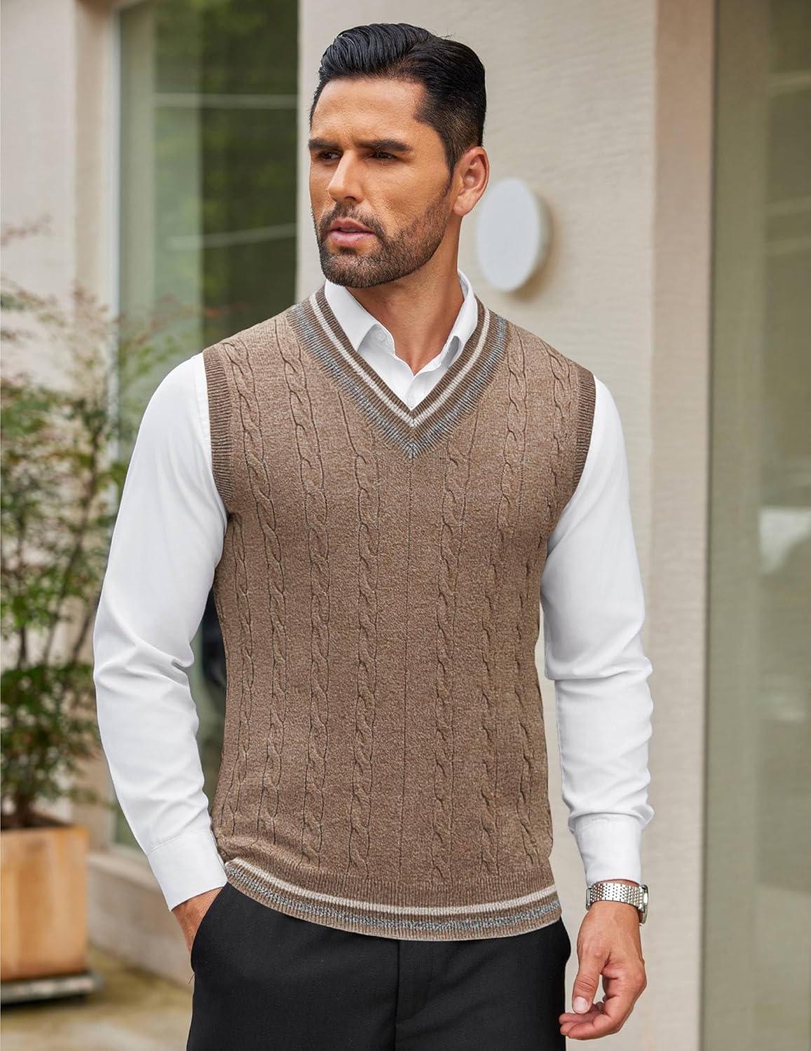 COOFANDY Men’s Sweater Vest V Neck Casual Sleeveless Pullover Striped Cable Knit Sweater Vest(Dark Khaki)