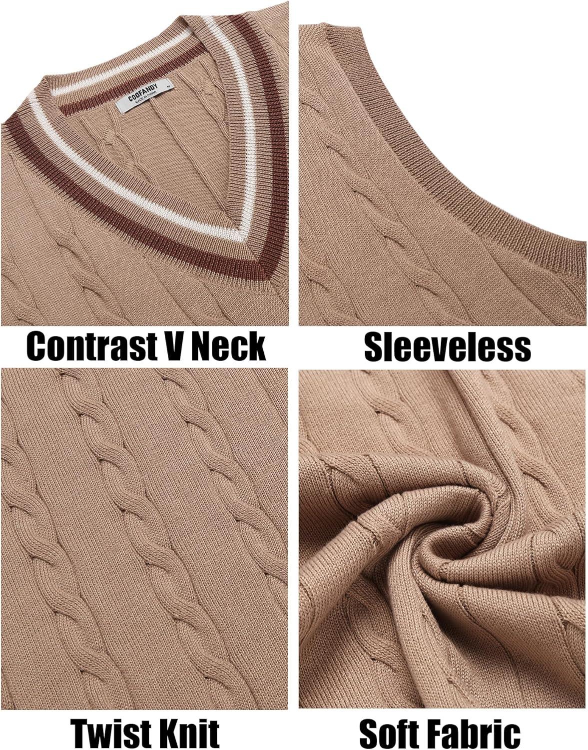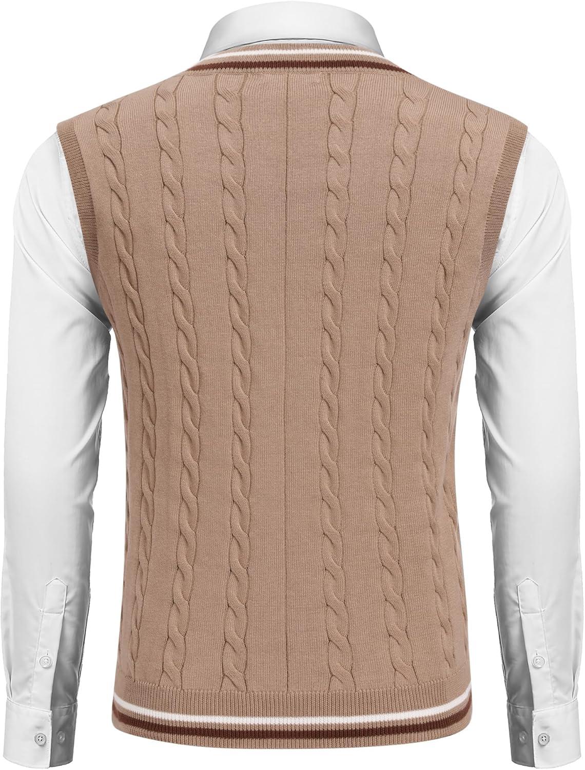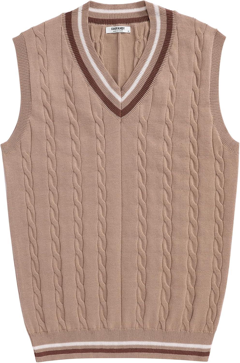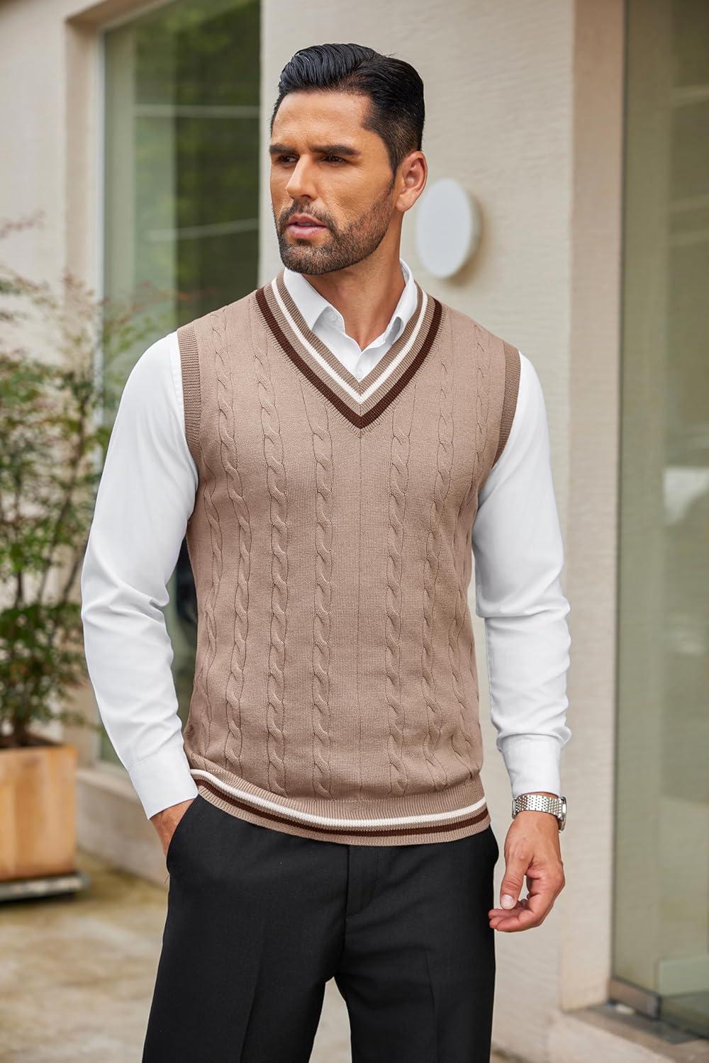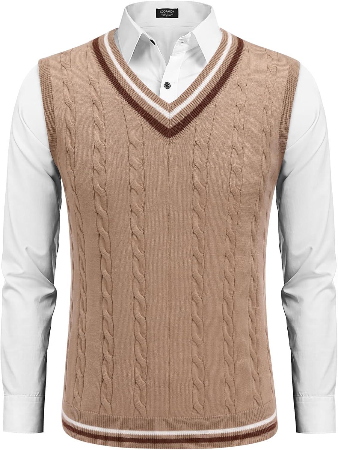 COOFANDY Men’s Sweater Vest V Neck Casual Sleeveless Pullover Striped Cable Knit Sweater Vest(Khaki)