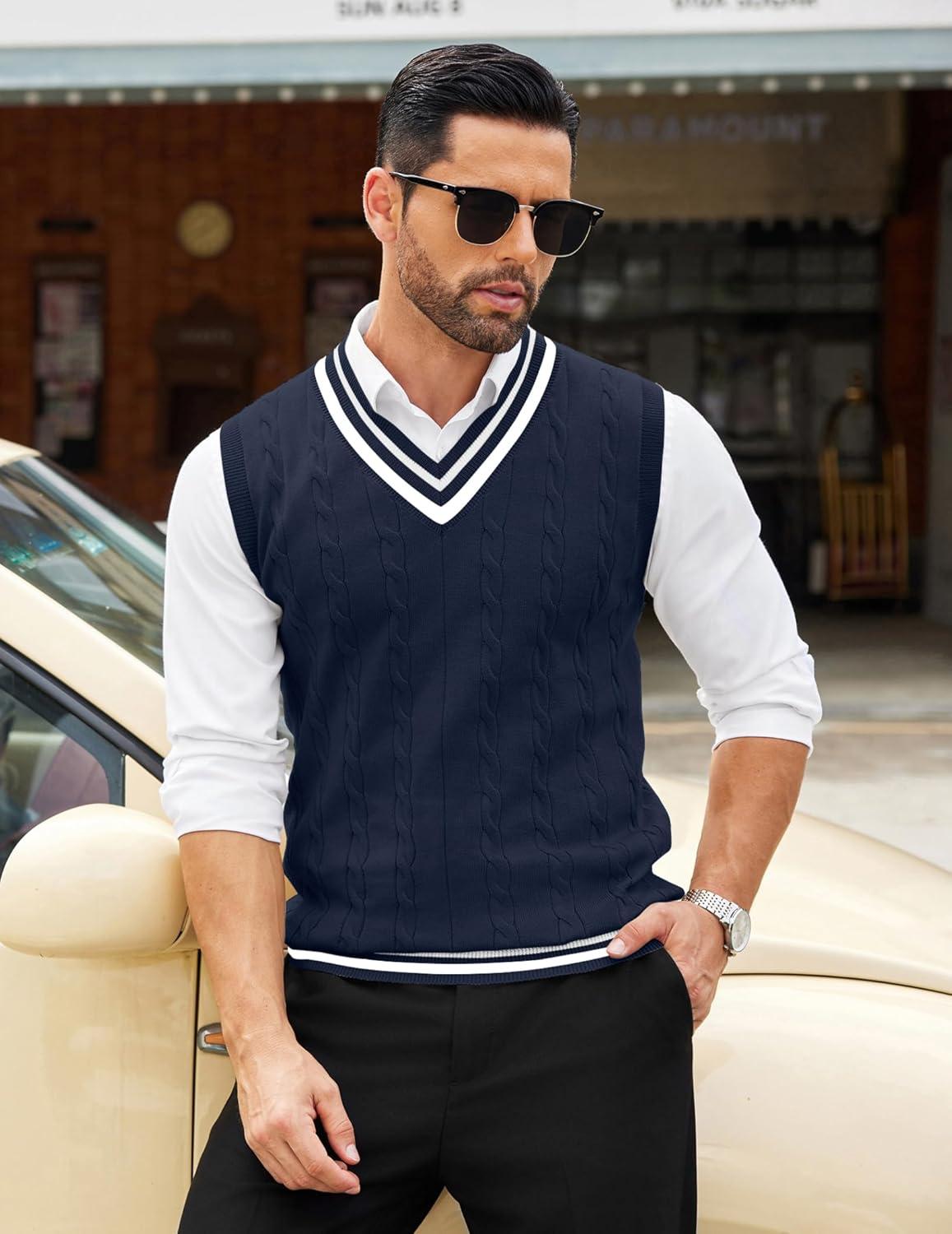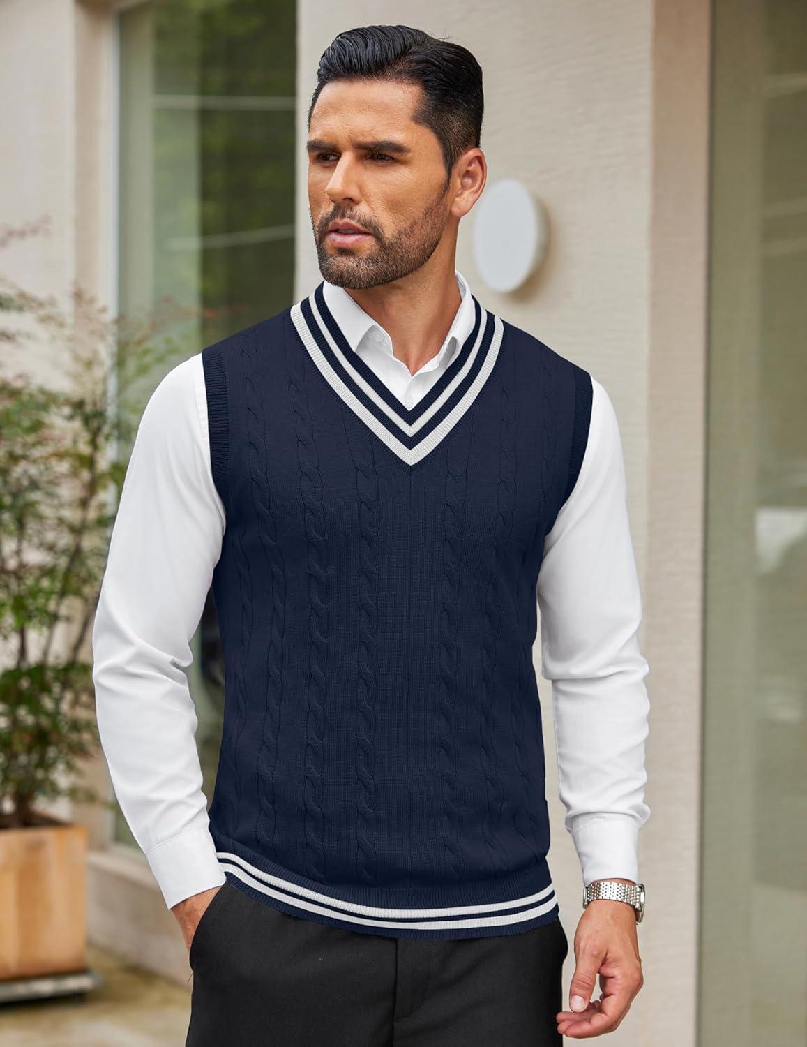COOFANDY Men’s Sweater Vest V Neck Casual Sleeveless Pullover Striped Cable Knit Sweater Vest(Navy Blue & White Stripe)