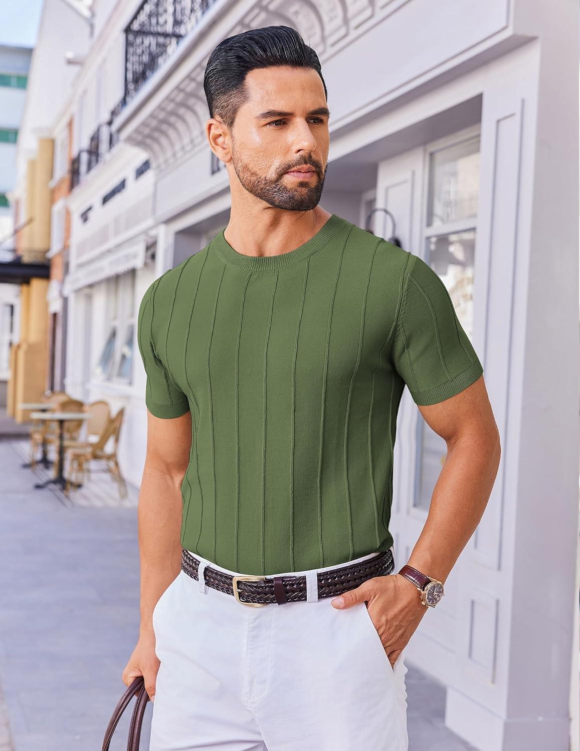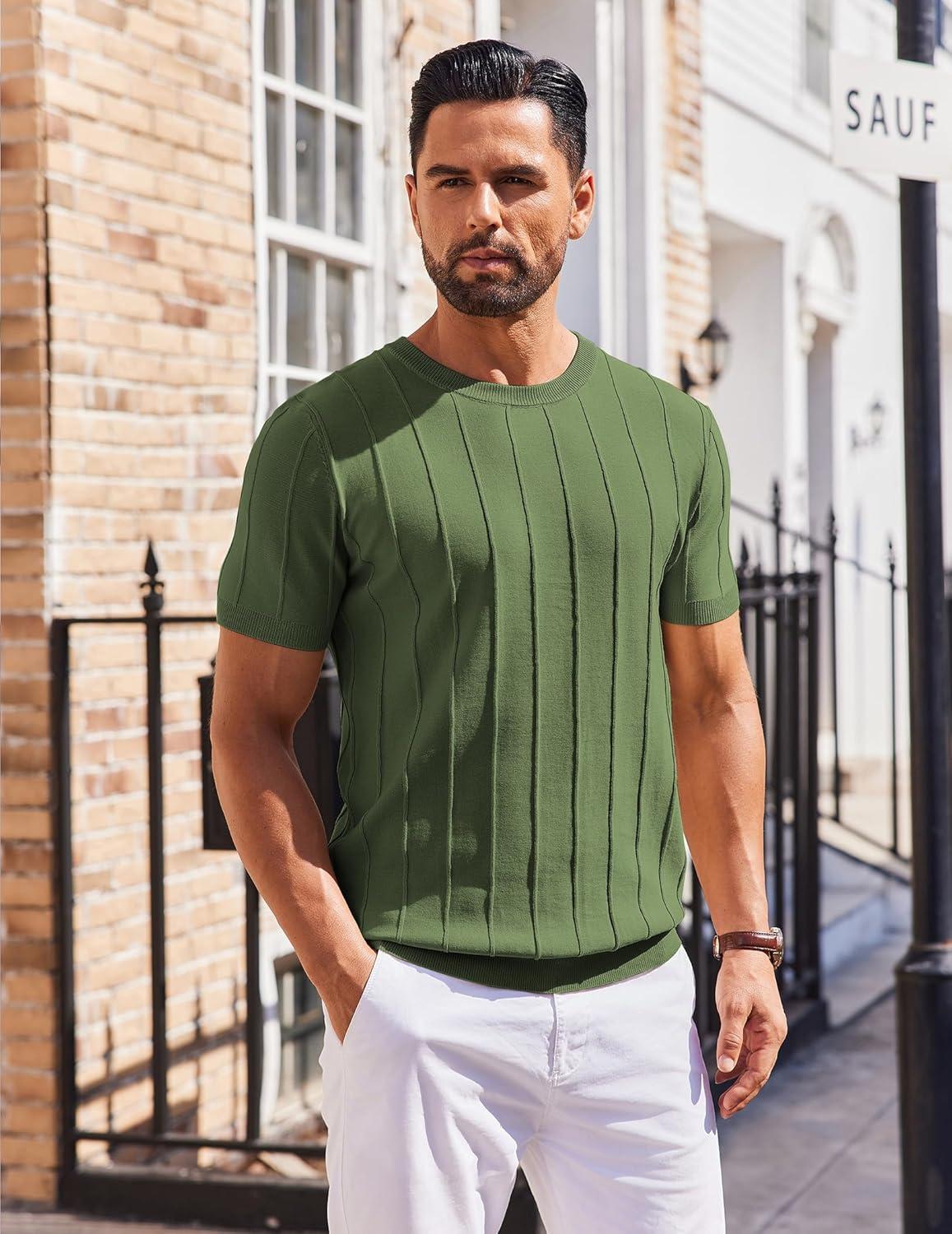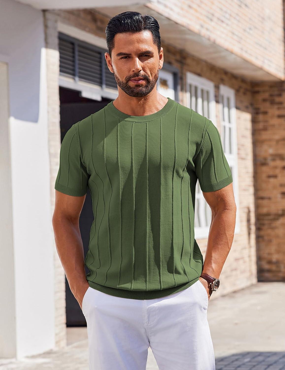 COOFANDY Men’s T- Shirts Short Sleeve Knit Sweater Shirt Casual Crewneck Ribbed Pullover Tees(Army Green)