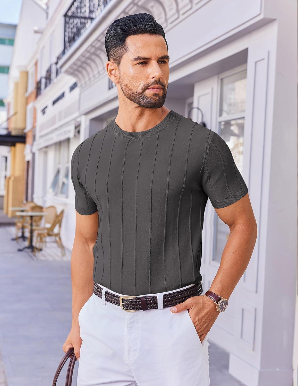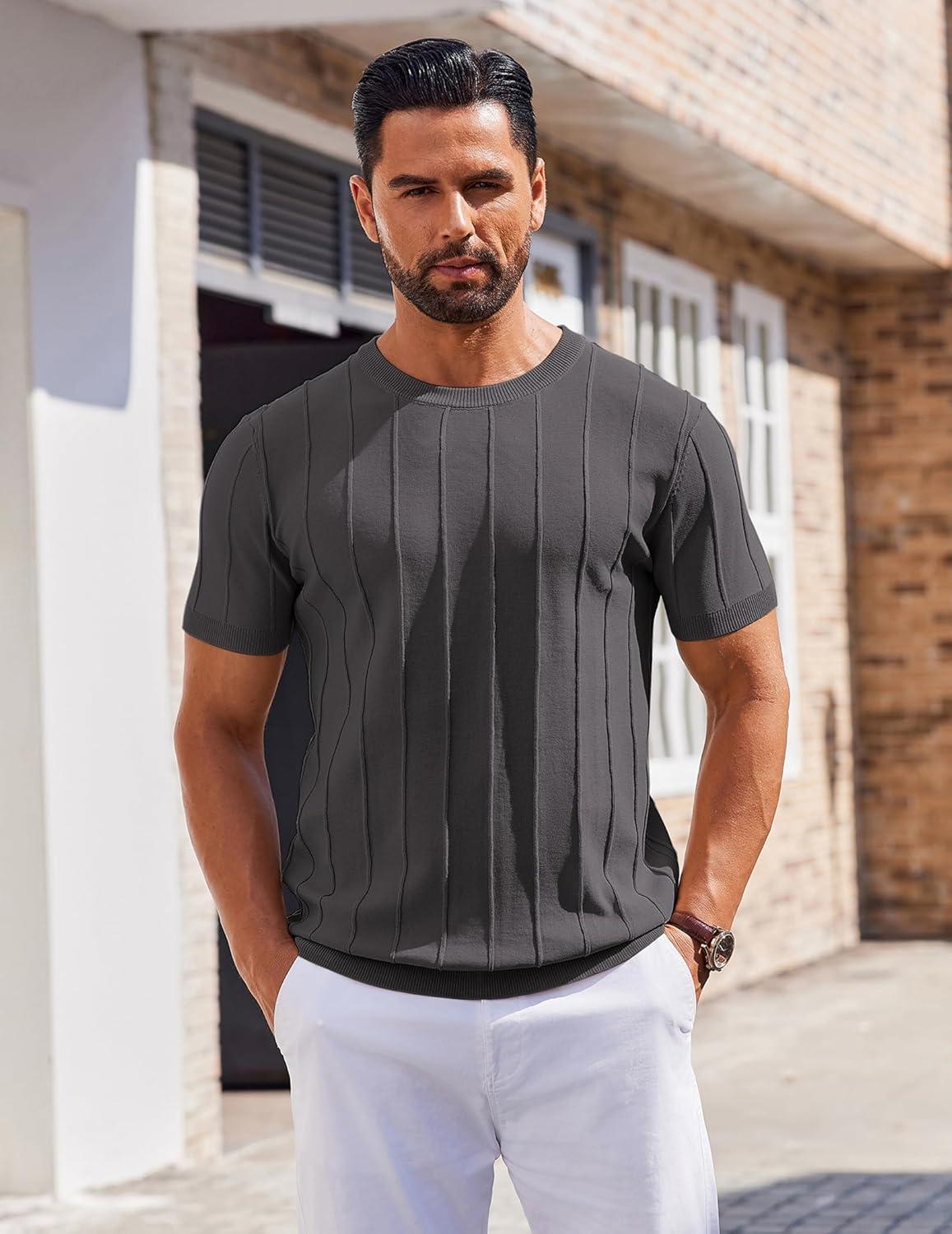 COOFANDY Men’s T- Shirts Short Sleeve Knit Sweater Shirt Casual Crewneck Ribbed Pullover Tees(Dark Grey)