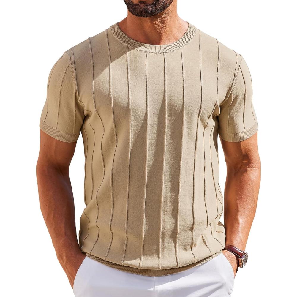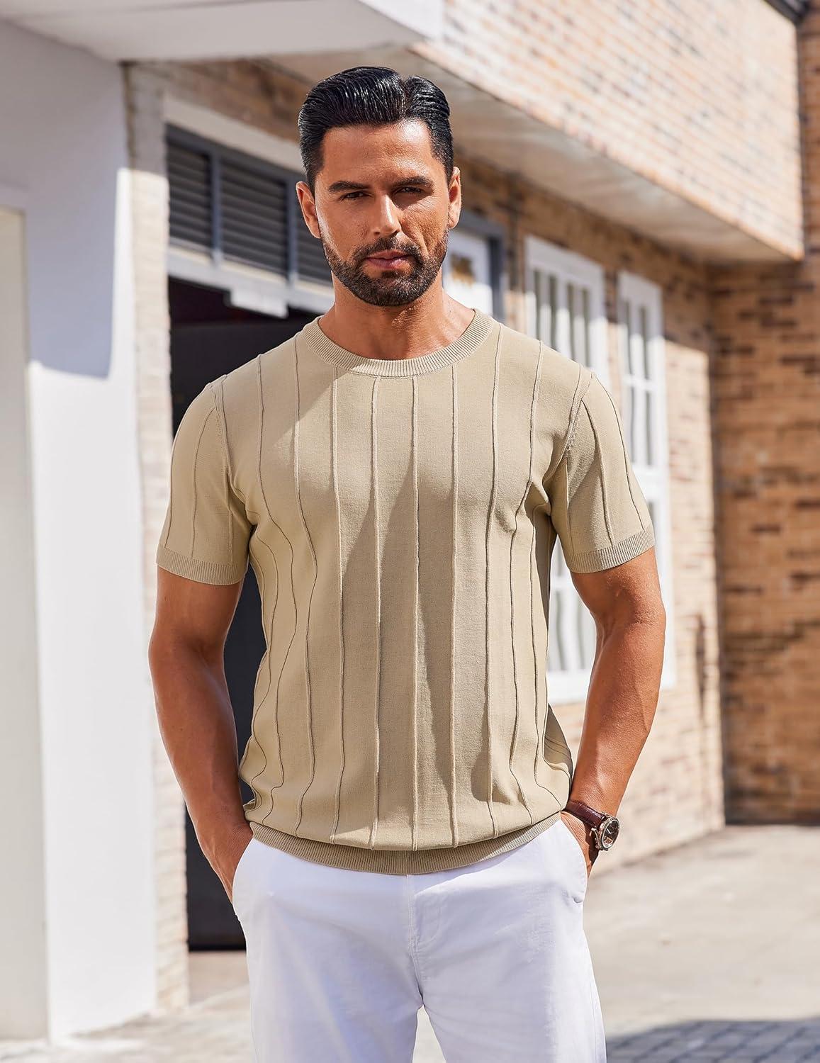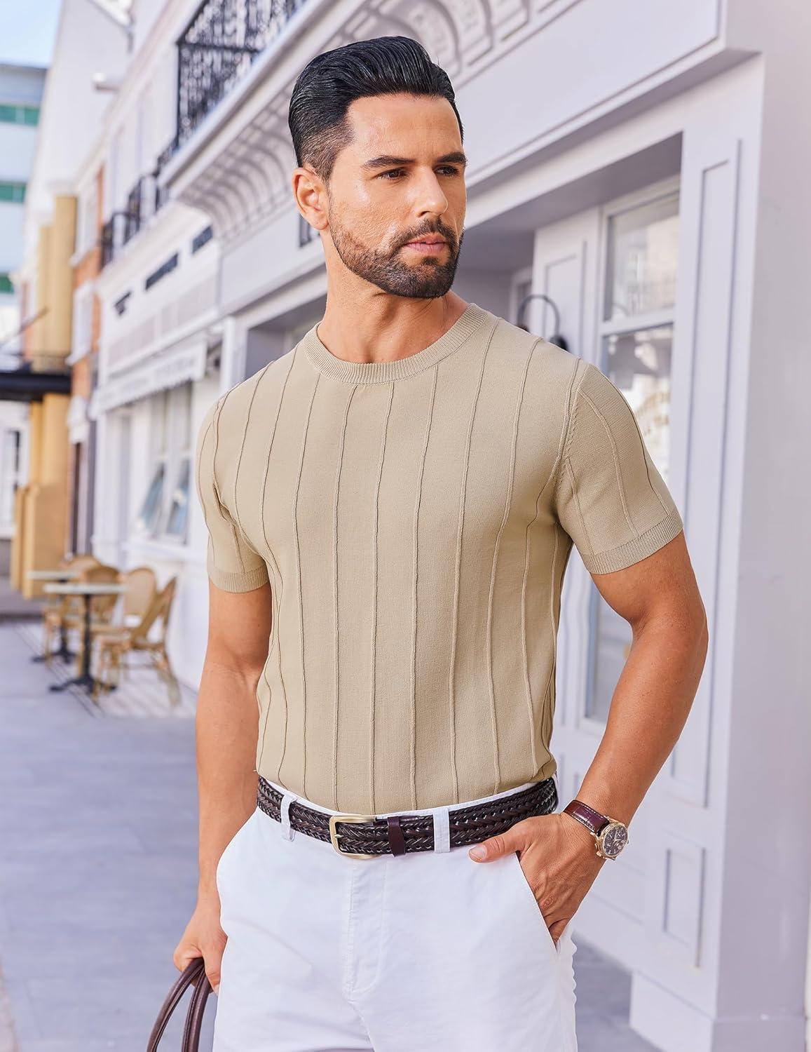 COOFANDY Men’s T- Shirts Short Sleeve Knit Sweater Shirt Casual Crewneck Ribbed Pullover Tees(Khaki)