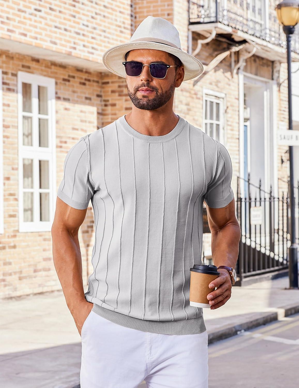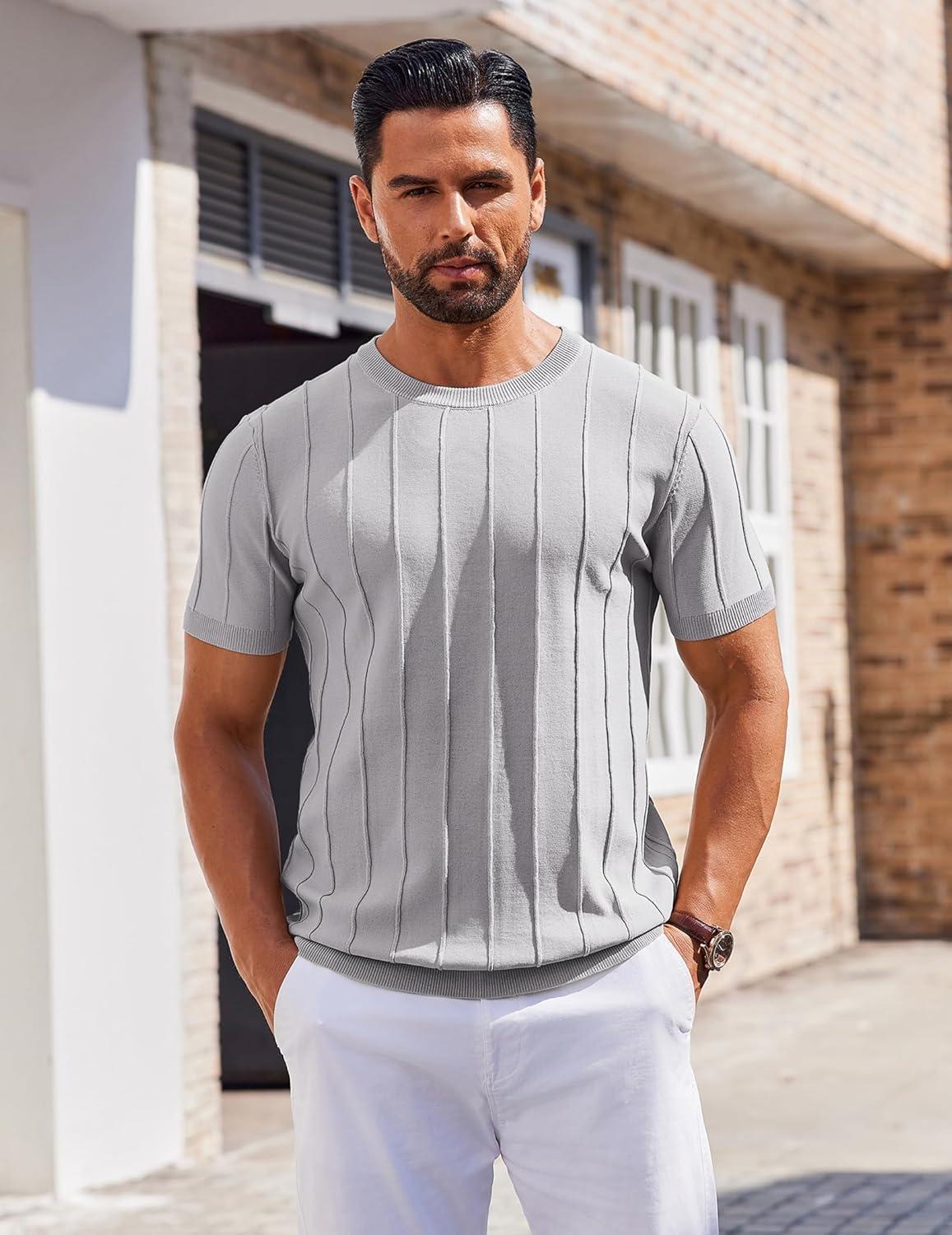 COOFANDY Men’s T- Shirts Short Sleeve Knit Sweater Shirt Casual Crewneck Ribbed Pullover Tees(Light Grey)