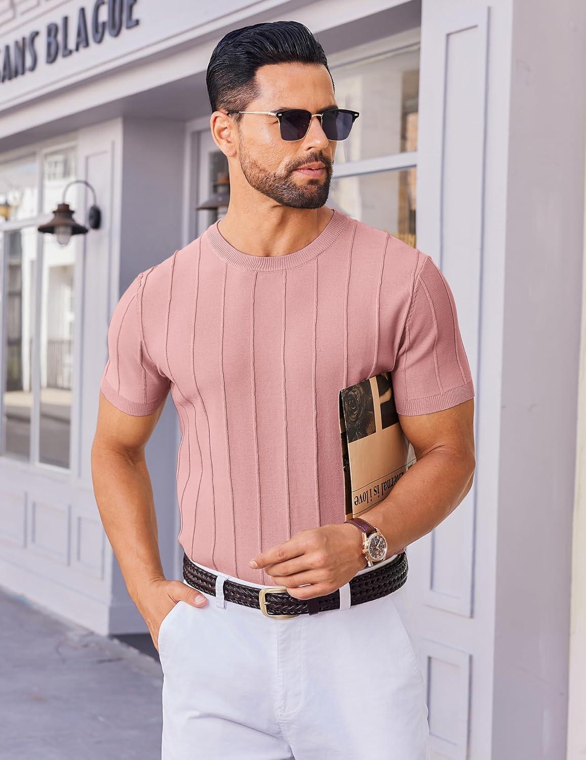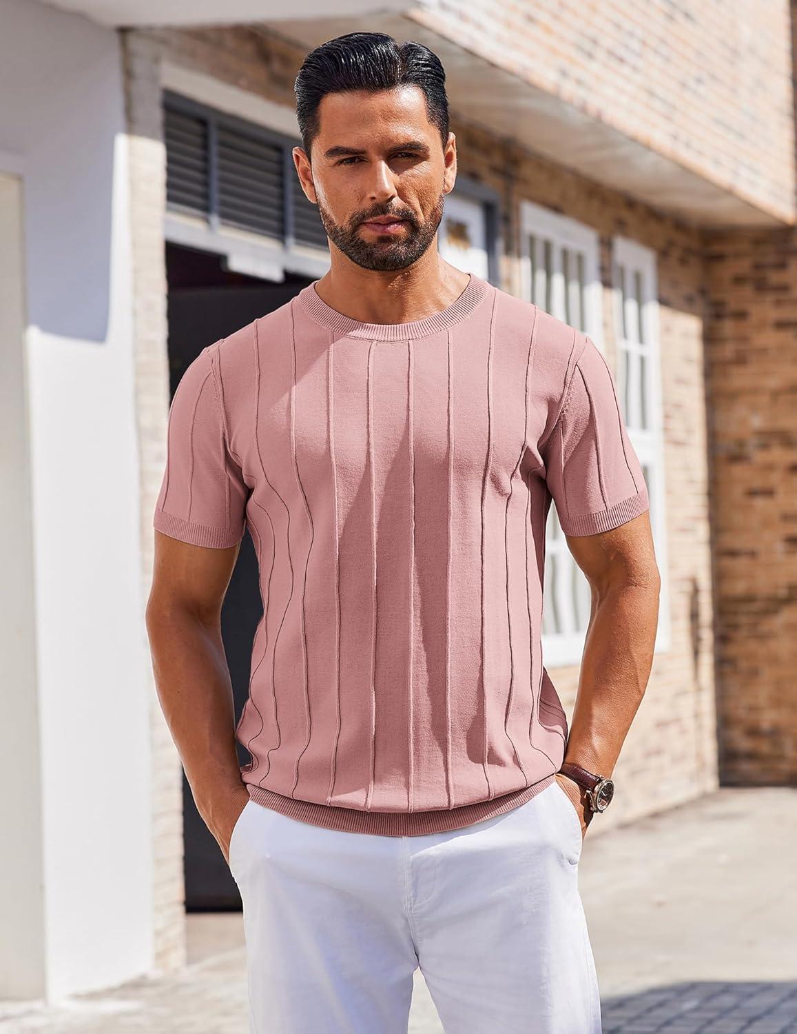 COOFANDY Men’s T- Shirts Short Sleeve Knit Sweater Shirt Casual Crewneck Ribbed Pullover Tees(Pink)