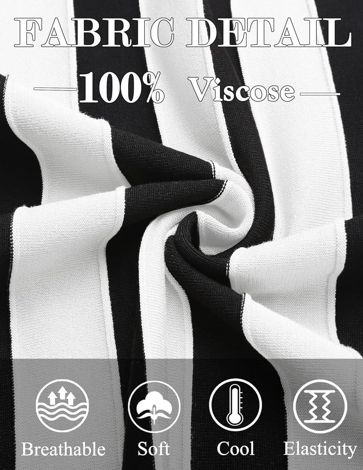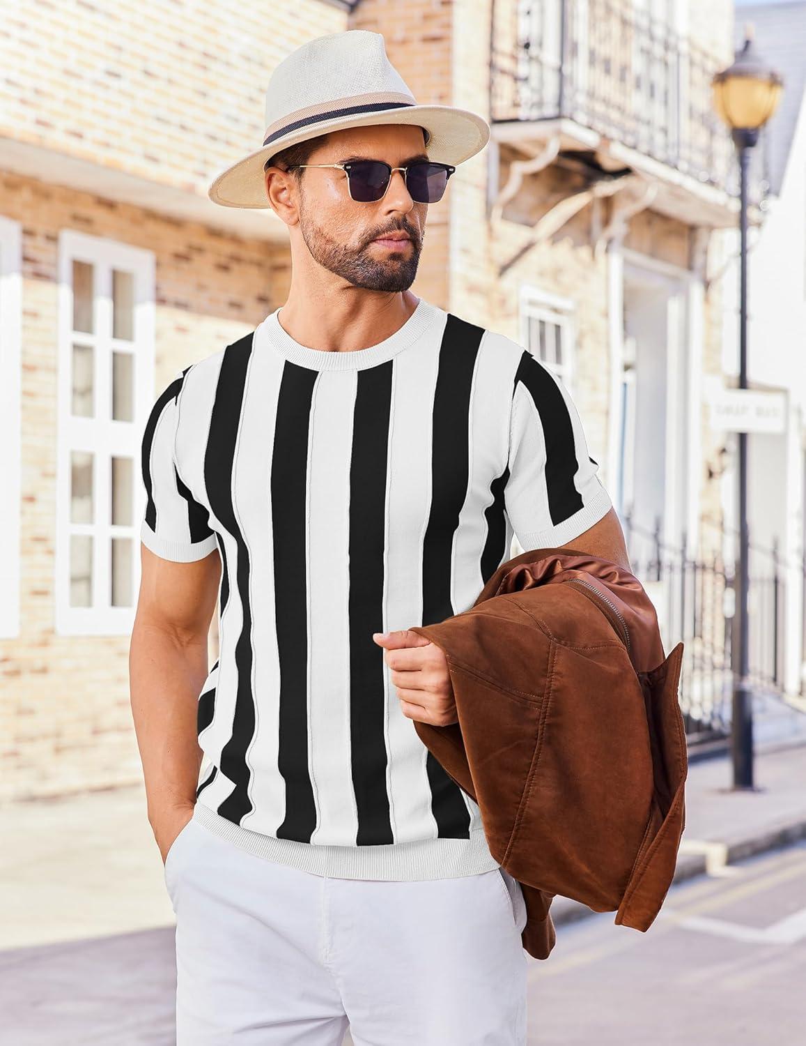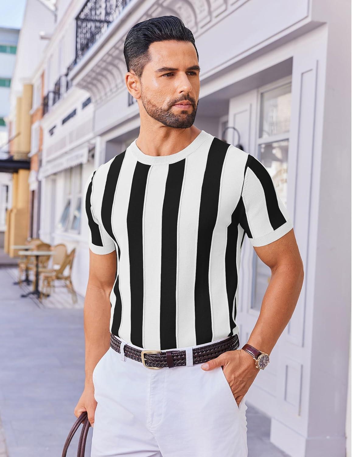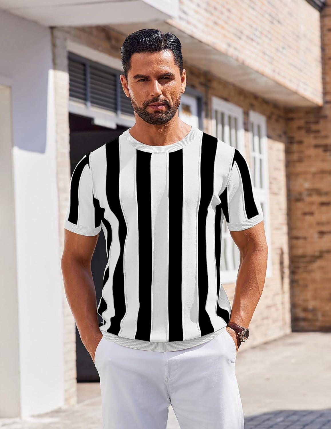 COOFANDY Men’s T- Shirts Short Sleeve Knit Sweater Shirt Casual Crewneck Ribbed Pullover Tees(White – Black Stripes)