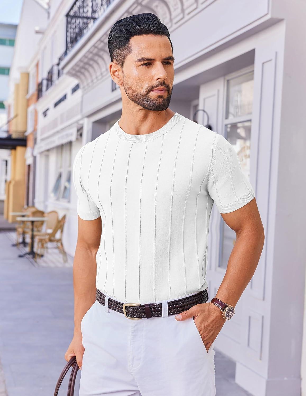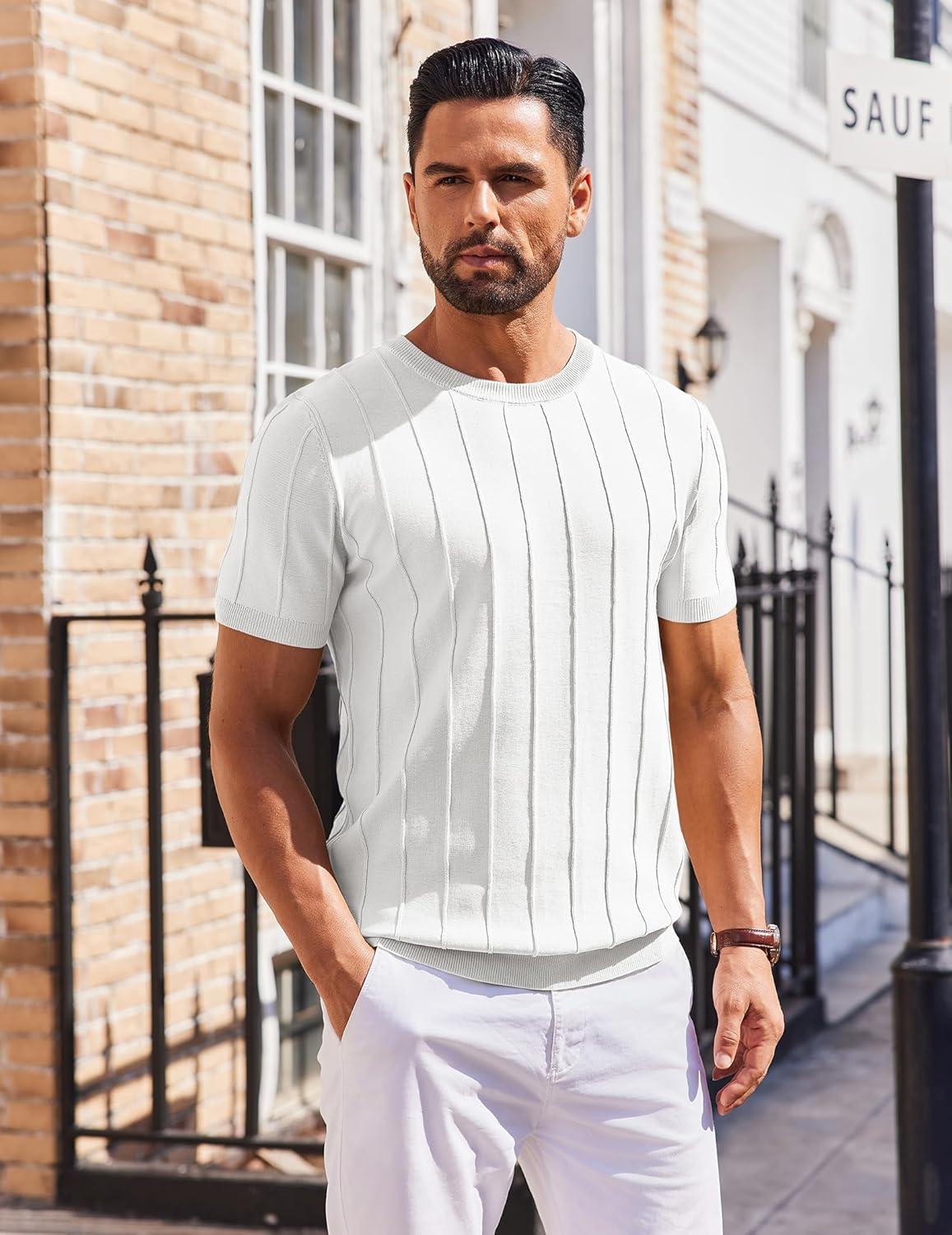 COOFANDY Men’s T- Shirts Short Sleeve Knit Sweater Shirt Casual Crewneck Ribbed Pullover Tees(White)