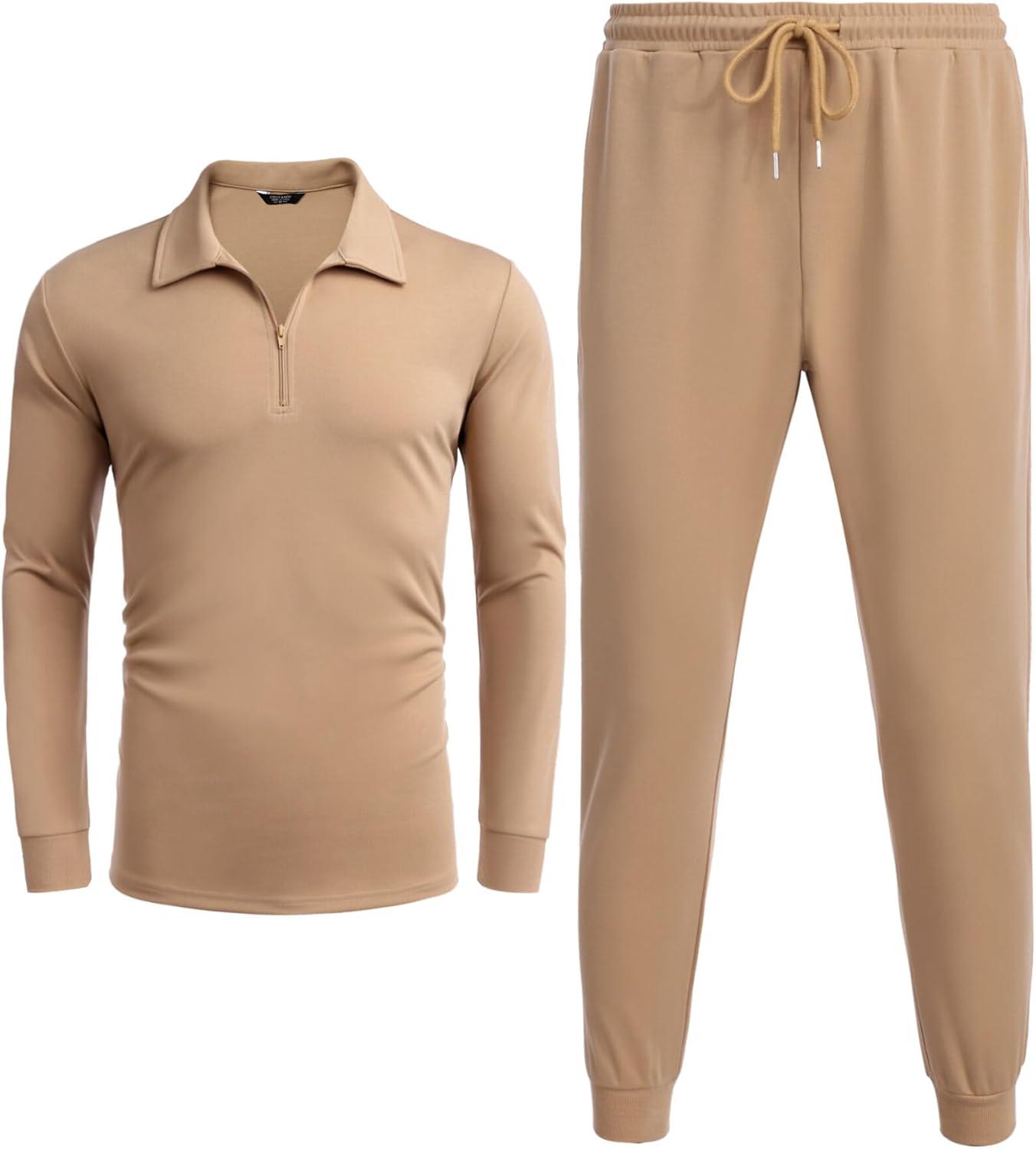 COOFANDY Men’s Tracksuit 2 Piece Quarter Zip Polo Athletic Sweatsuits Casual Running Jogging Sport Suit Sets(Khaki)