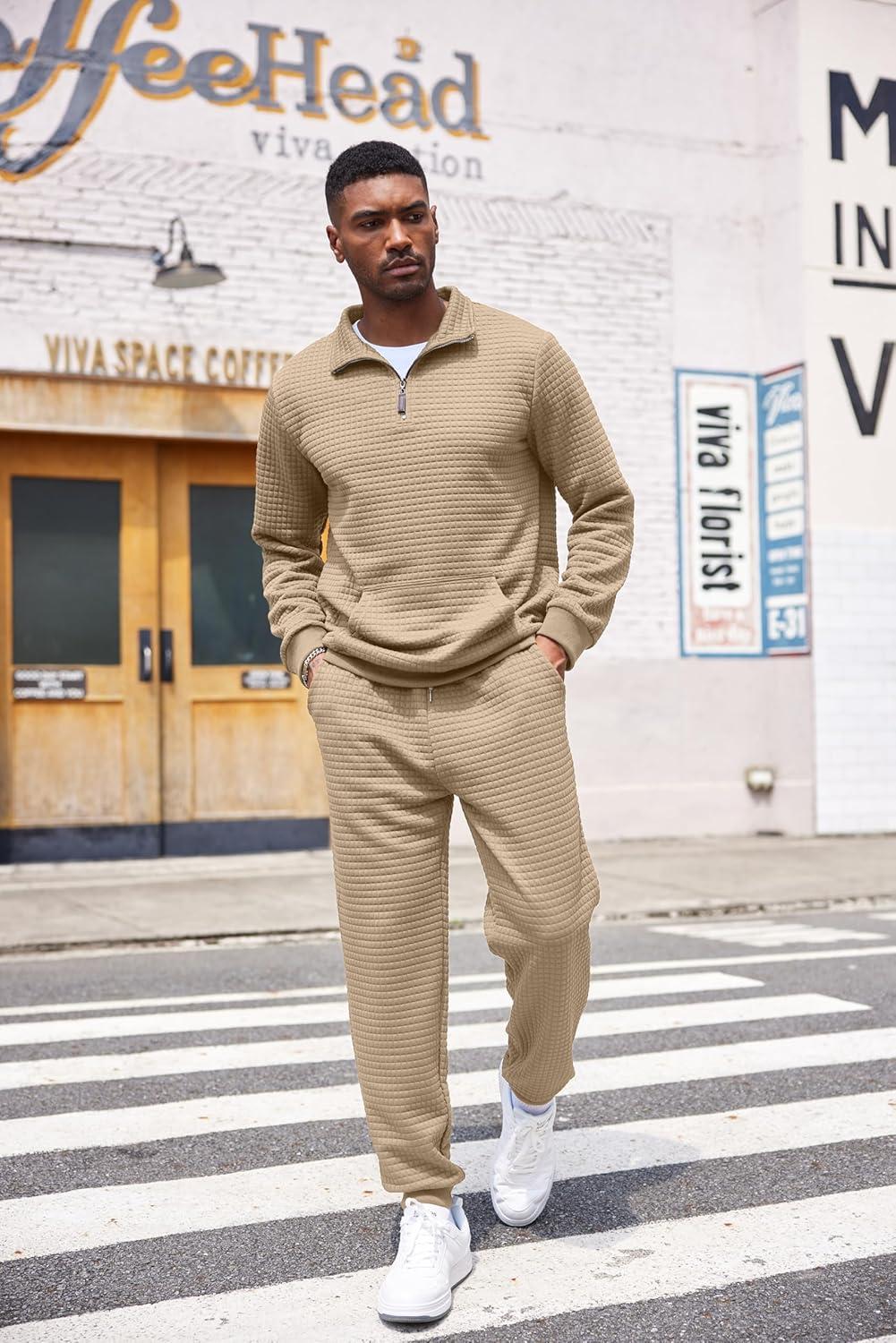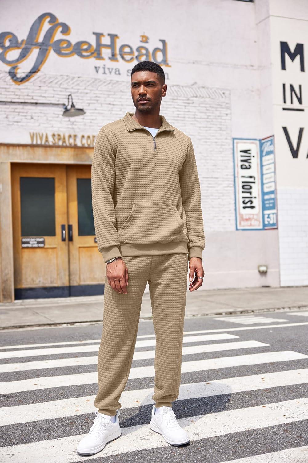 COOFANDY Men’s Tracksuit 2 Piece Quarter Zip Sweatsuit Workout Plaid Jacquard Jogging Suit Set(Khaki)