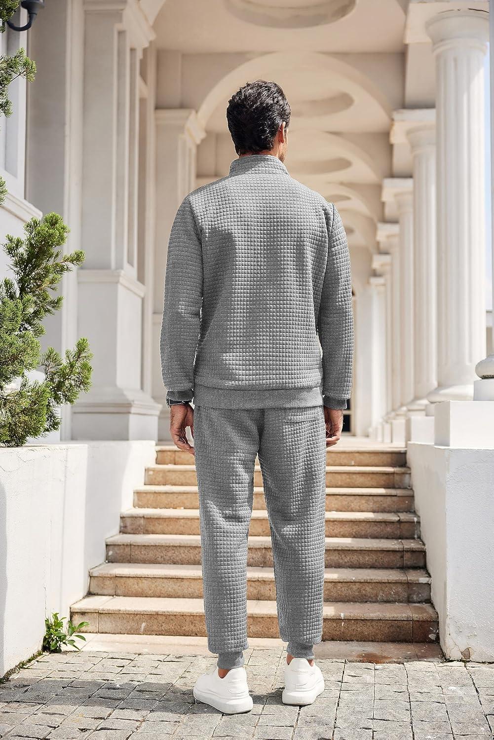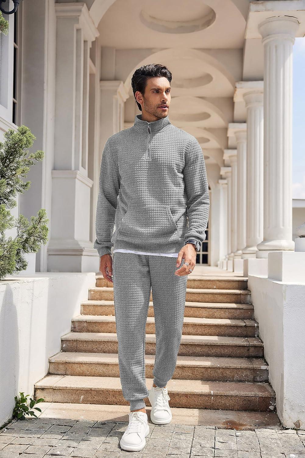 COOFANDY Men’s Tracksuit 2 Piece Quarter Zip Sweatsuit Workout Plaid Jacquard Jogging Suit Set(Light Grey)
