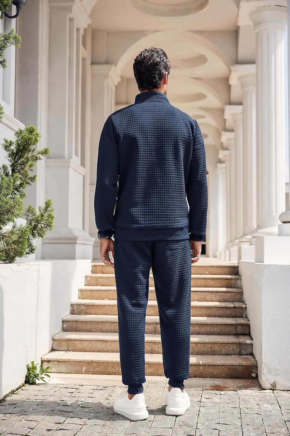 COOFANDY Men’s Tracksuit 2 Piece Quarter Zip Sweatsuit Workout Plaid Jacquard Jogging Suit Set(Navy Blue)