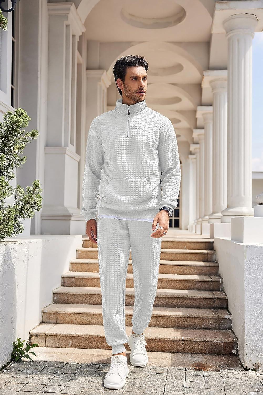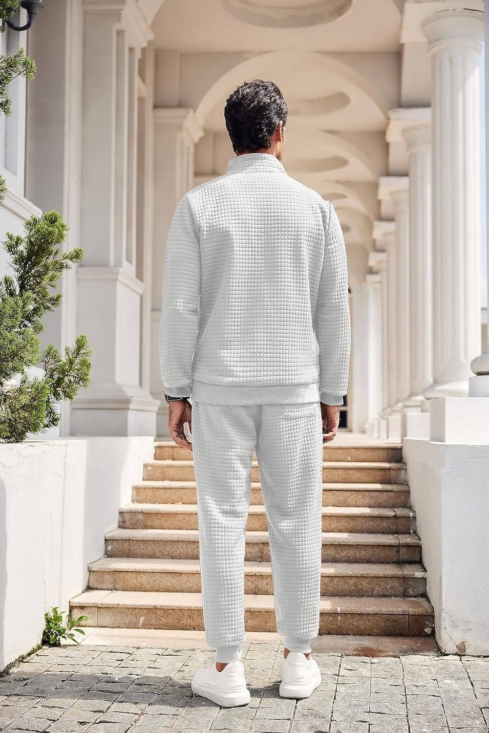COOFANDY Men’s Tracksuit 2 Piece Quarter Zip Sweatsuit Workout Plaid Jacquard Jogging Suit Set(White)