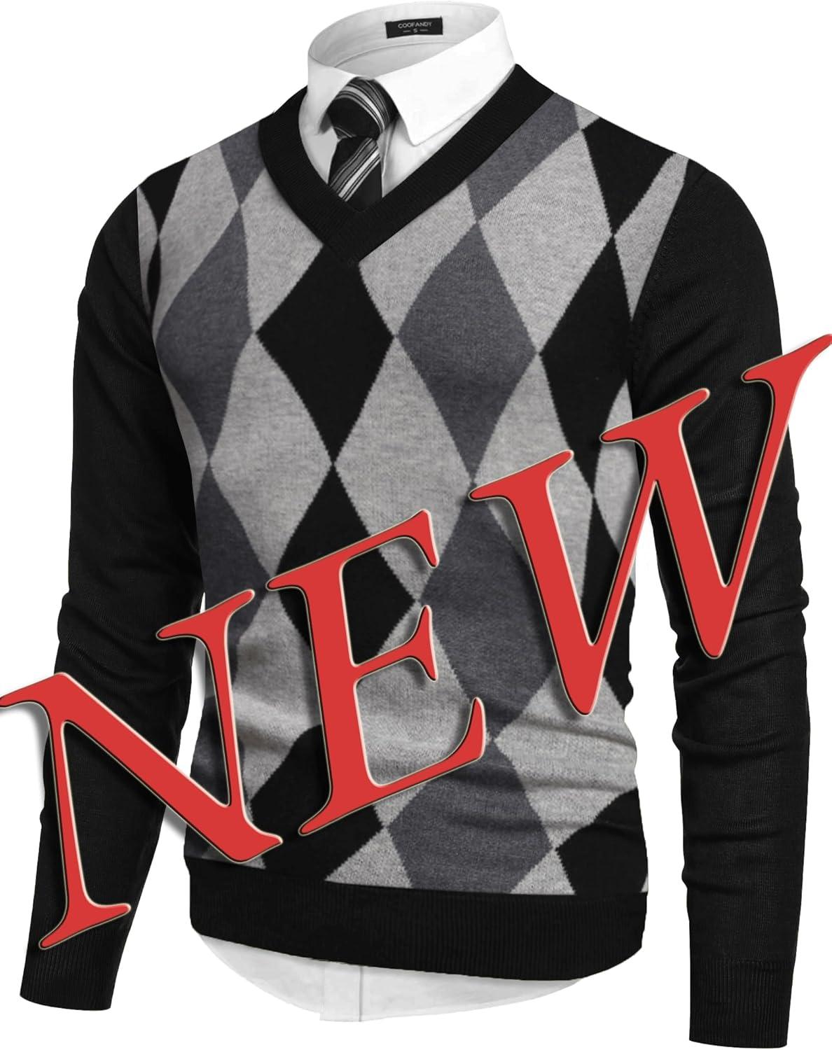 COOFANDY Mens V Neck Dress Sweater Knit Long Sleeve Slim Fit Sweaters Fashion Pullover Sweater(Balck Grey Argyle)
