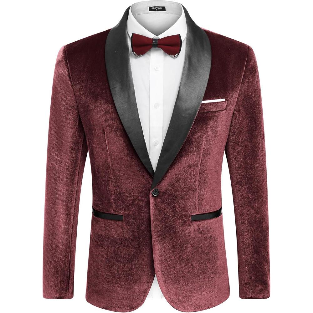 COOFANDY Men’s Velvet Tuxedo One Button Jacket Dinner Prom Wedding Blazer Jacket(Wine Red)