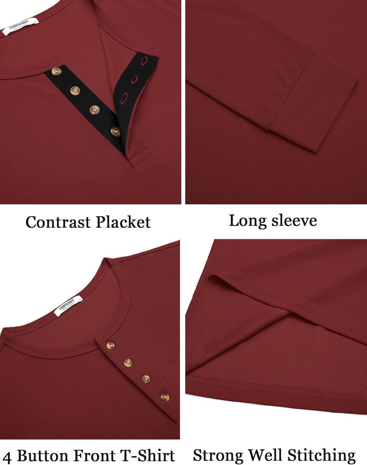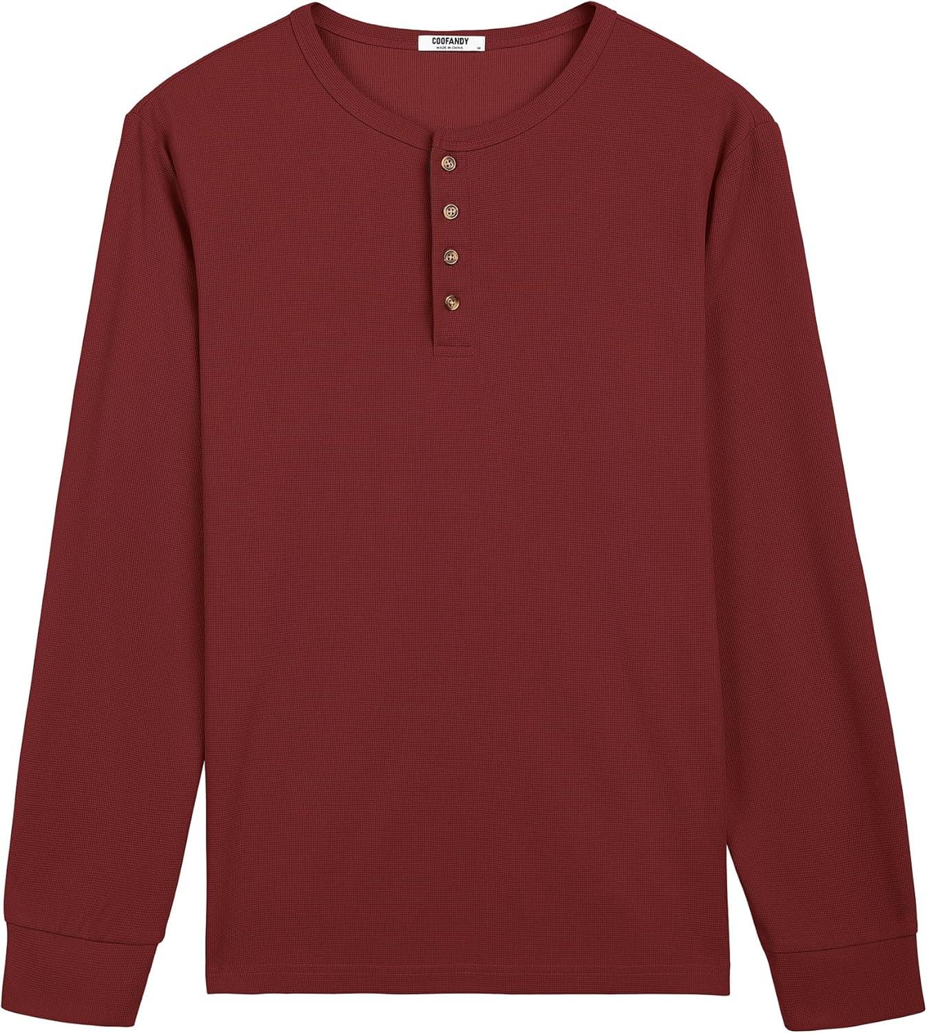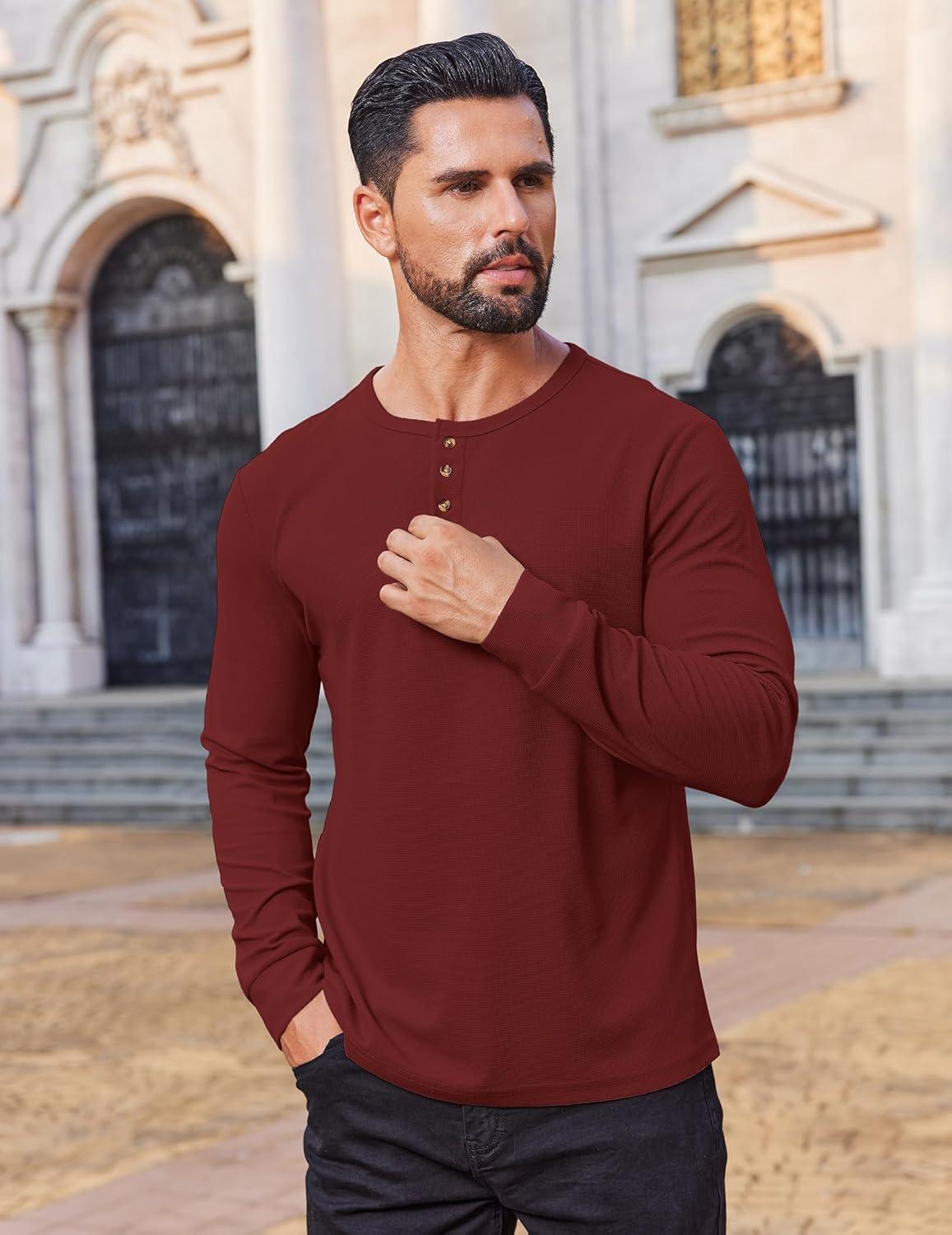 COOFANDY Mens Waffle Henley Shirts Long Sleeve Casual T-Shirt Basic Lightweight Pullover Tees(Wine Red)