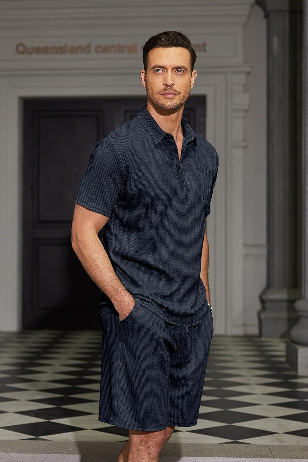 COOFANDY Men’s Waffle Knit Polo Shirt and Shorts Set 2 Pieces Outfits Summer Suit Casual Tracksuit with Pockets(Navy Blue)