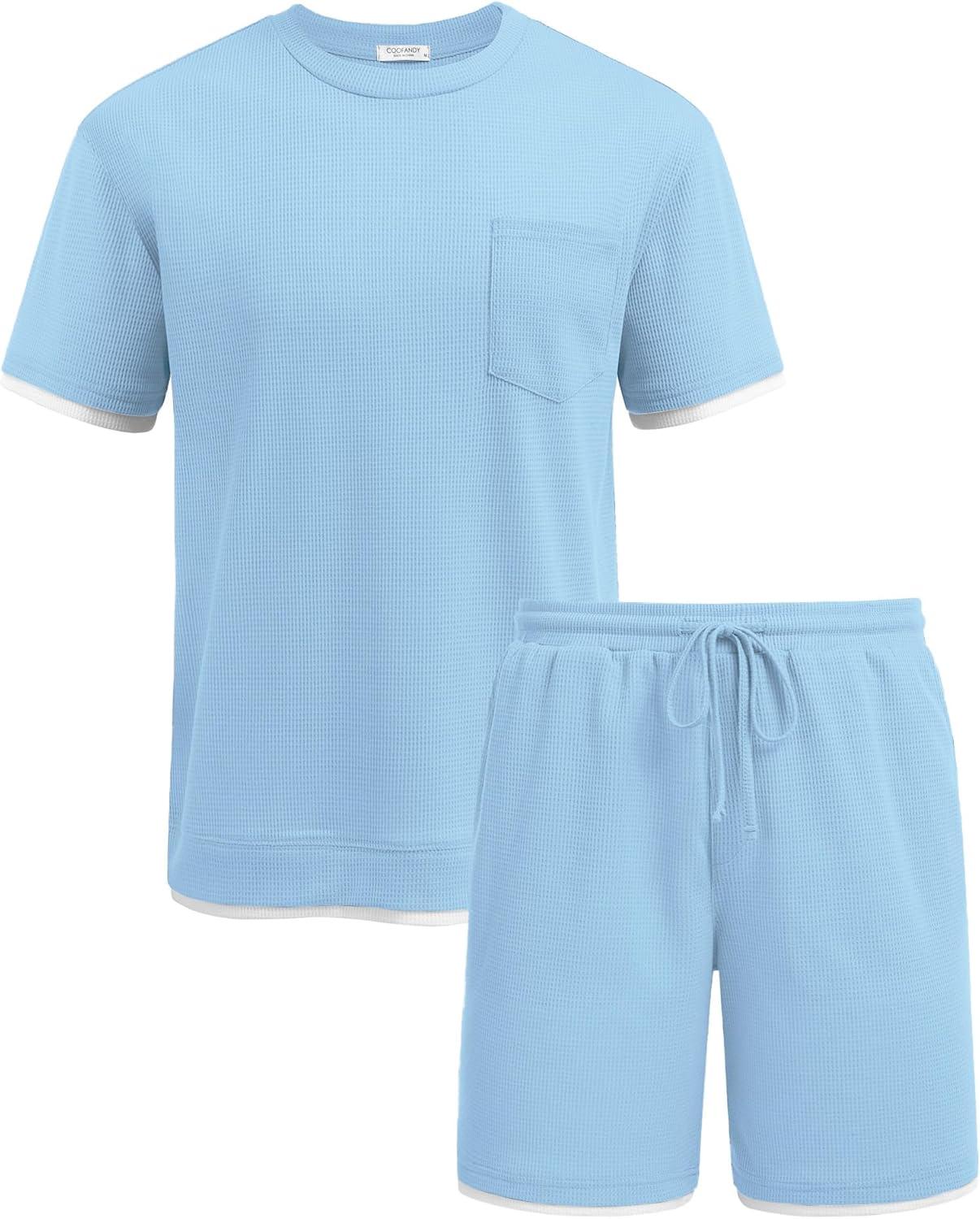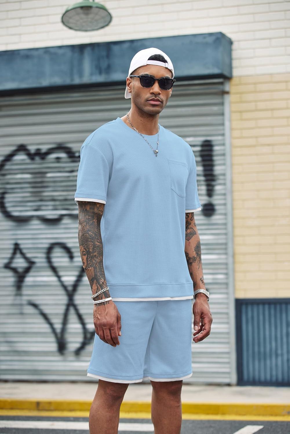 COOFANDY Men’s Waffle Shirt and Shorts Set 2 Piece Outfits Casual Summer Tracksuits Set with Pockets(Light Blue)