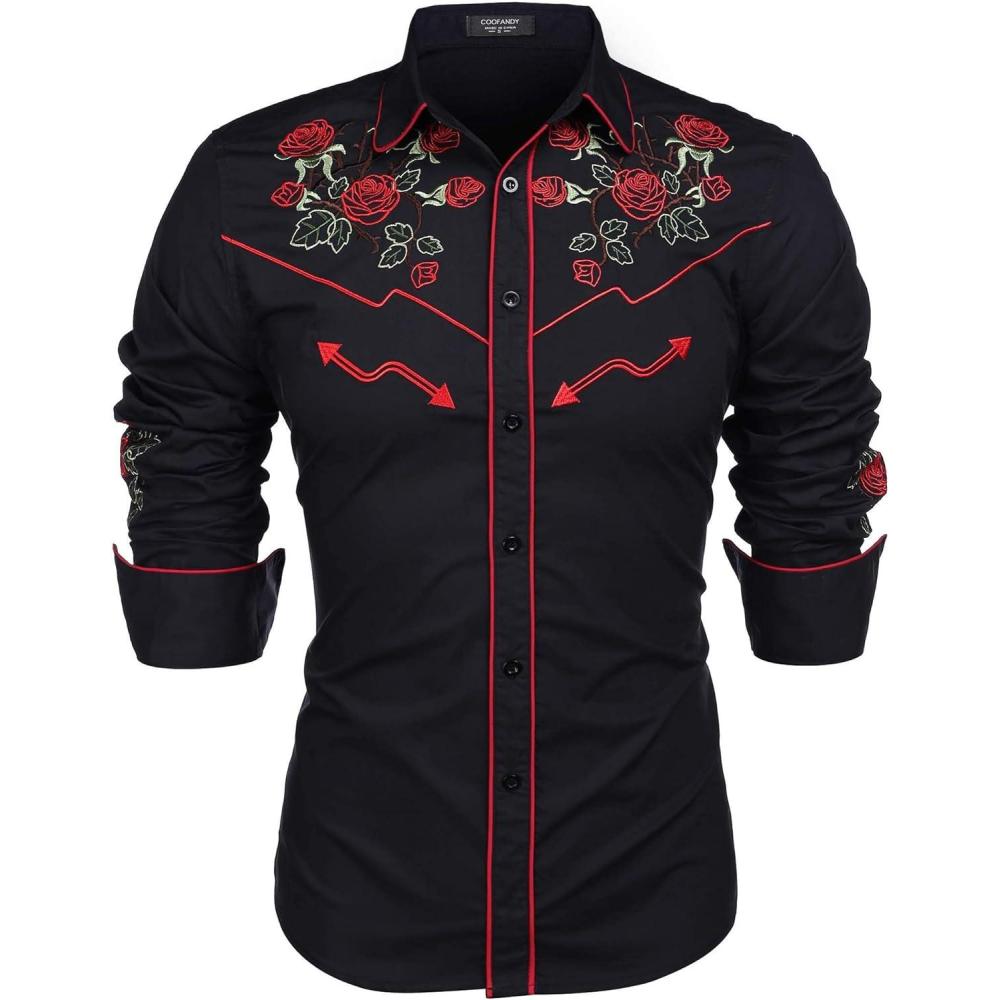 COOFANDY Men’s Western Cowboy Shirt Embroidered Button Down Long Sleeve Shirts(Black (Rose))