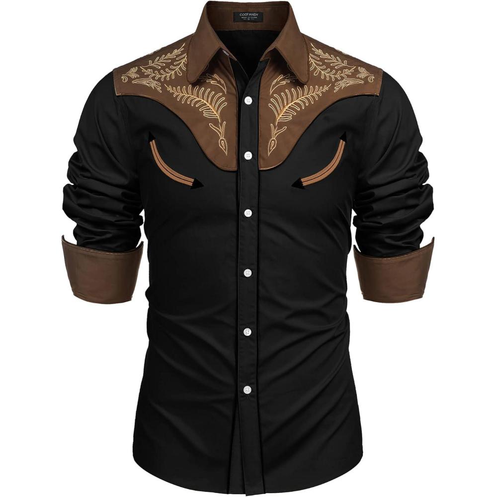 COOFANDY Men’s Western Cowboy Shirt Embroidered Button Down Long Sleeve Shirts(Cotton – Black & Brown)