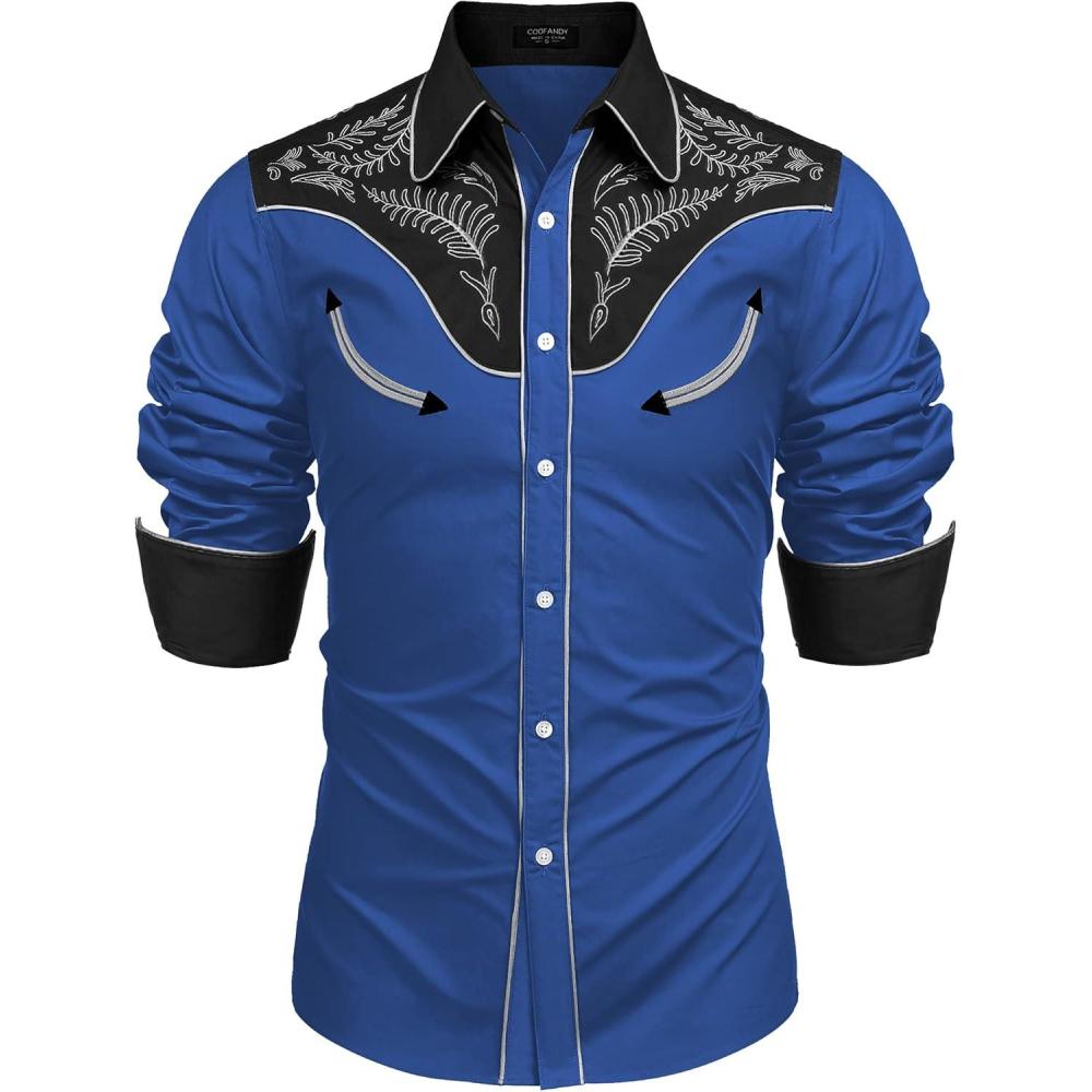 COOFANDY Men’s Western Cowboy Shirt Embroidered Button Down Long Sleeve Shirts(Cotton – Blue & Black)