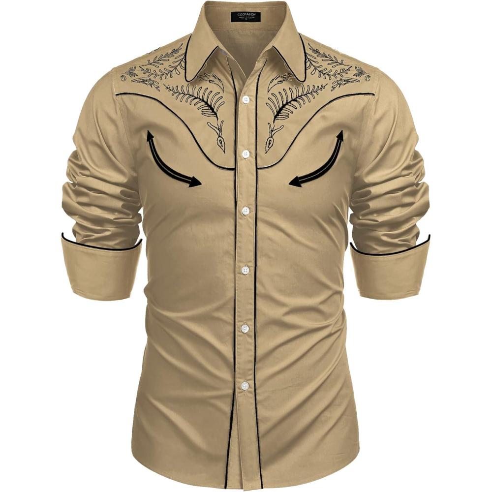 COOFANDY Men’s Western Cowboy Shirt Embroidered Button Down Long Sleeve Shirts(Cotton – Light Khaki)