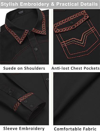 COOFANDY Men’s Western Cowboy Shirt Embroidered Long Sleeve Slim Fit Casual Cotton Button Down Hippie Shirts with Pockets(Black -2)