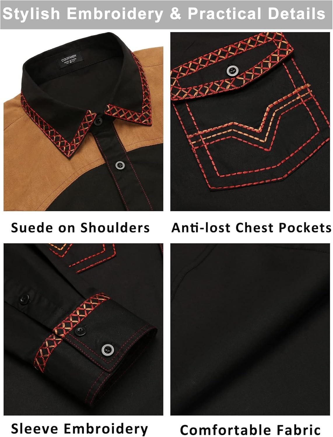 COOFANDY Men’s Western Cowboy Shirt Embroidered Long Sleeve Slim Fit Casual Cotton Button Down Hippie Shirts with Pockets(Black)