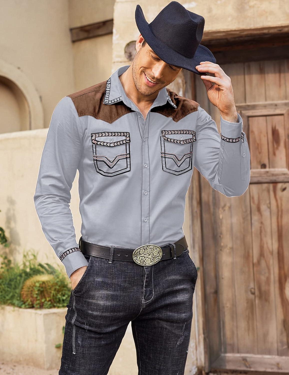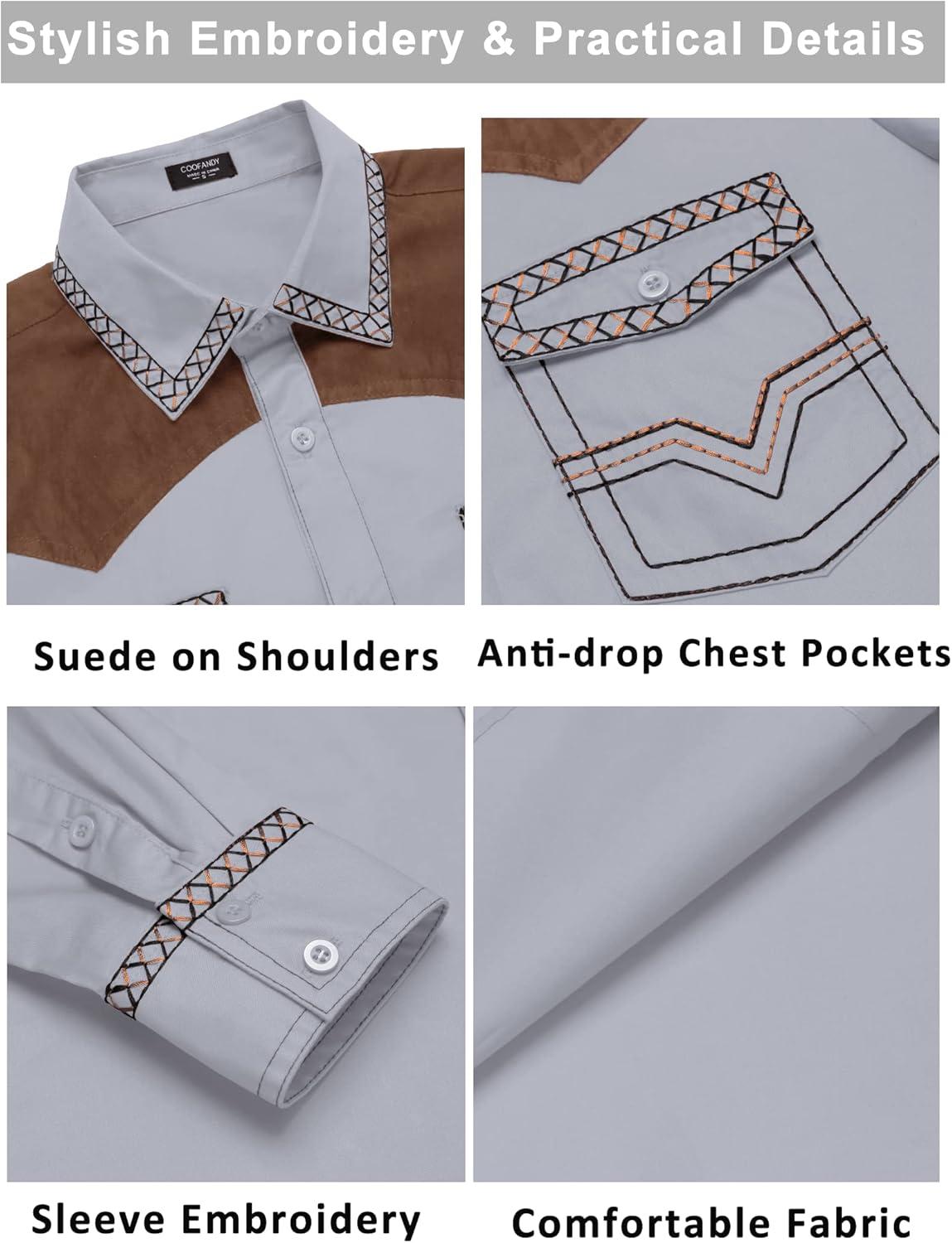 COOFANDY Men’s Western Cowboy Shirt Embroidered Long Sleeve Slim Fit Casual Cotton Button Down Hippie Shirts with Pockets(Grey)
