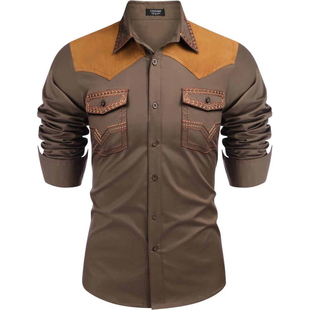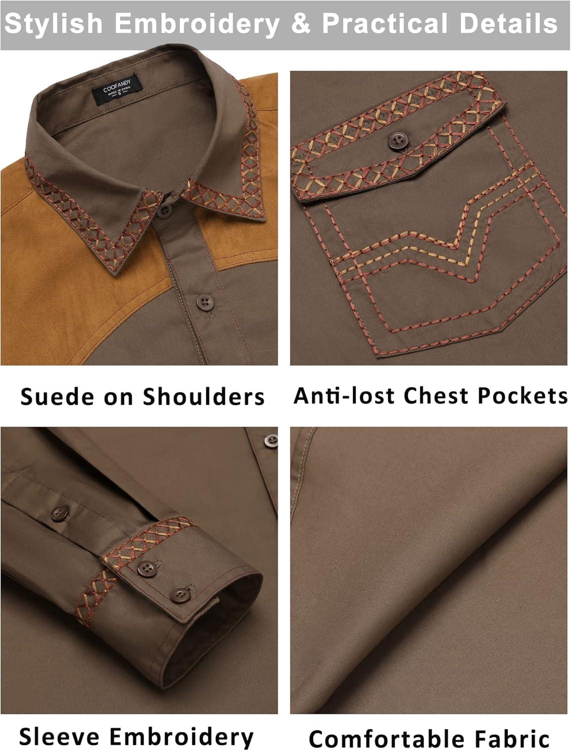 COOFANDY Men’s Western Cowboy Shirt Embroidered Long Sleeve Slim Fit Casual Cotton Button Down Hippie Shirts with Pockets(Khaki)