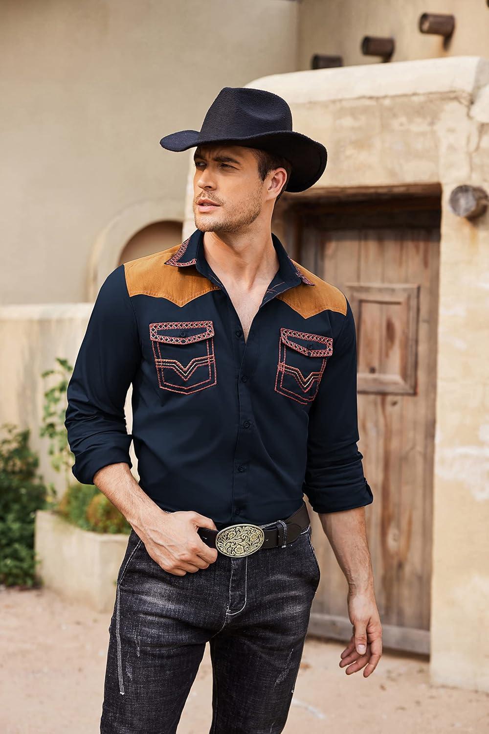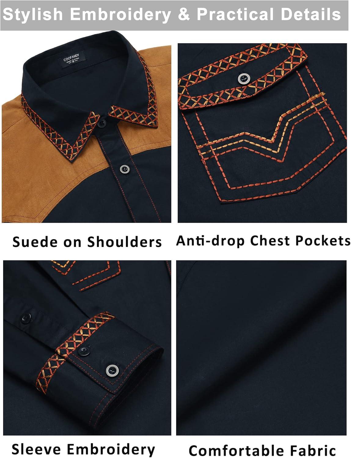 COOFANDY Men’s Western Cowboy Shirt Embroidered Long Sleeve Slim Fit Casual Cotton Button Down Hippie Shirts with Pockets(Navy Blue)