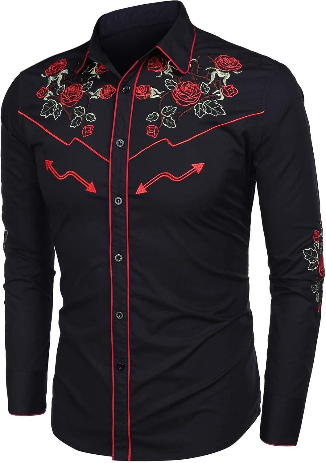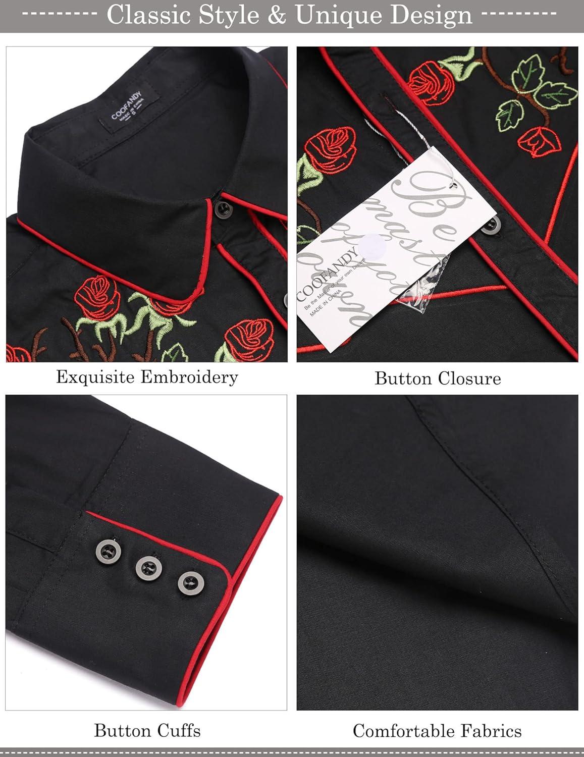 COOFANDY Men’s Western Cowboy Shirt Long Sleeve Embroidered Shirt Slim Fit Cotton Casual Button Down Shirt(Black (Rose))