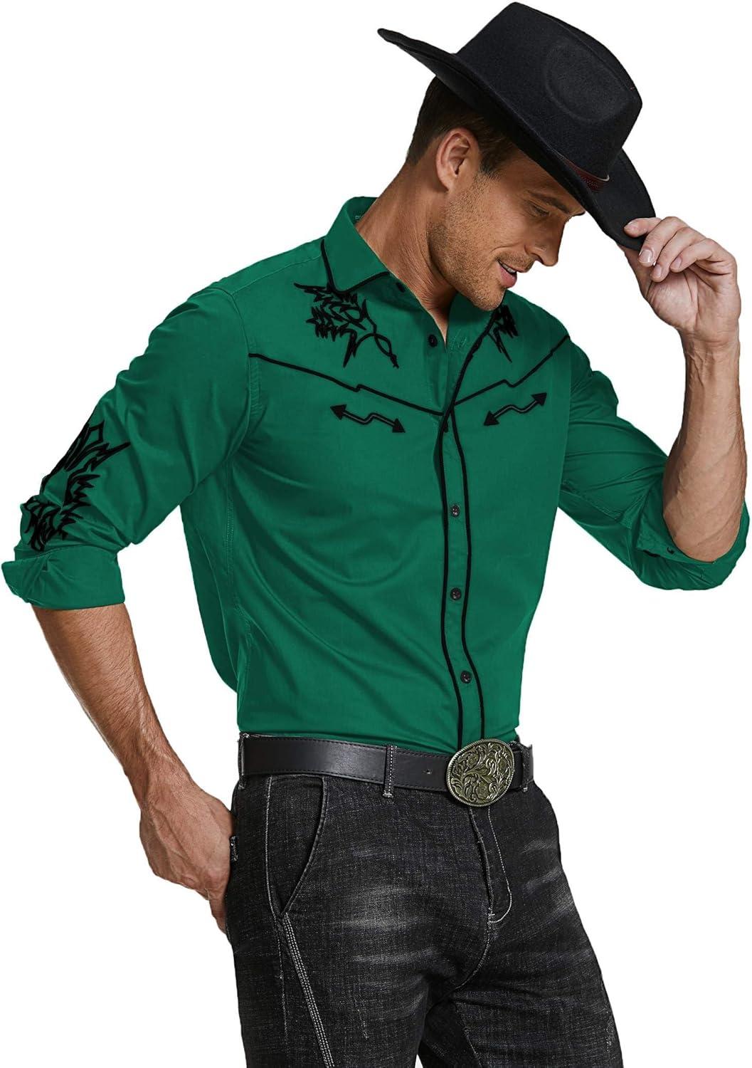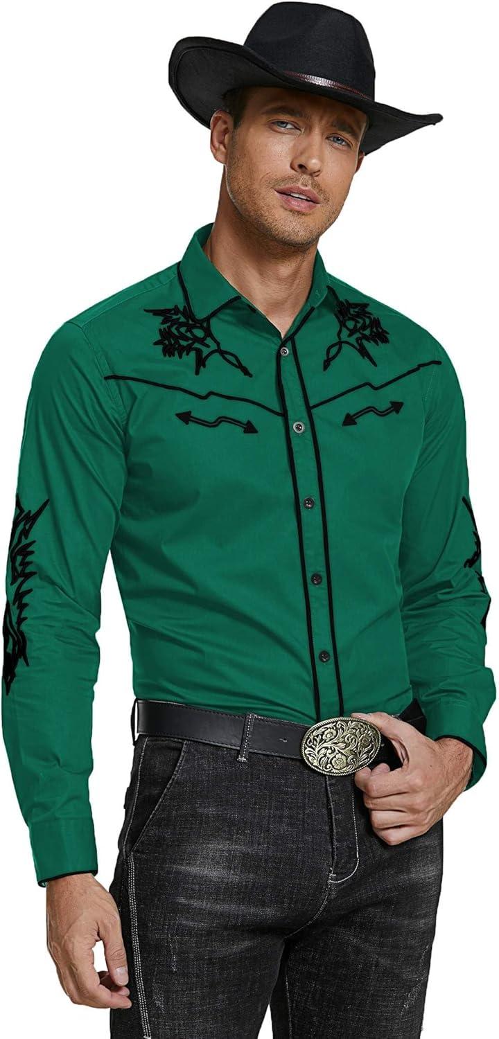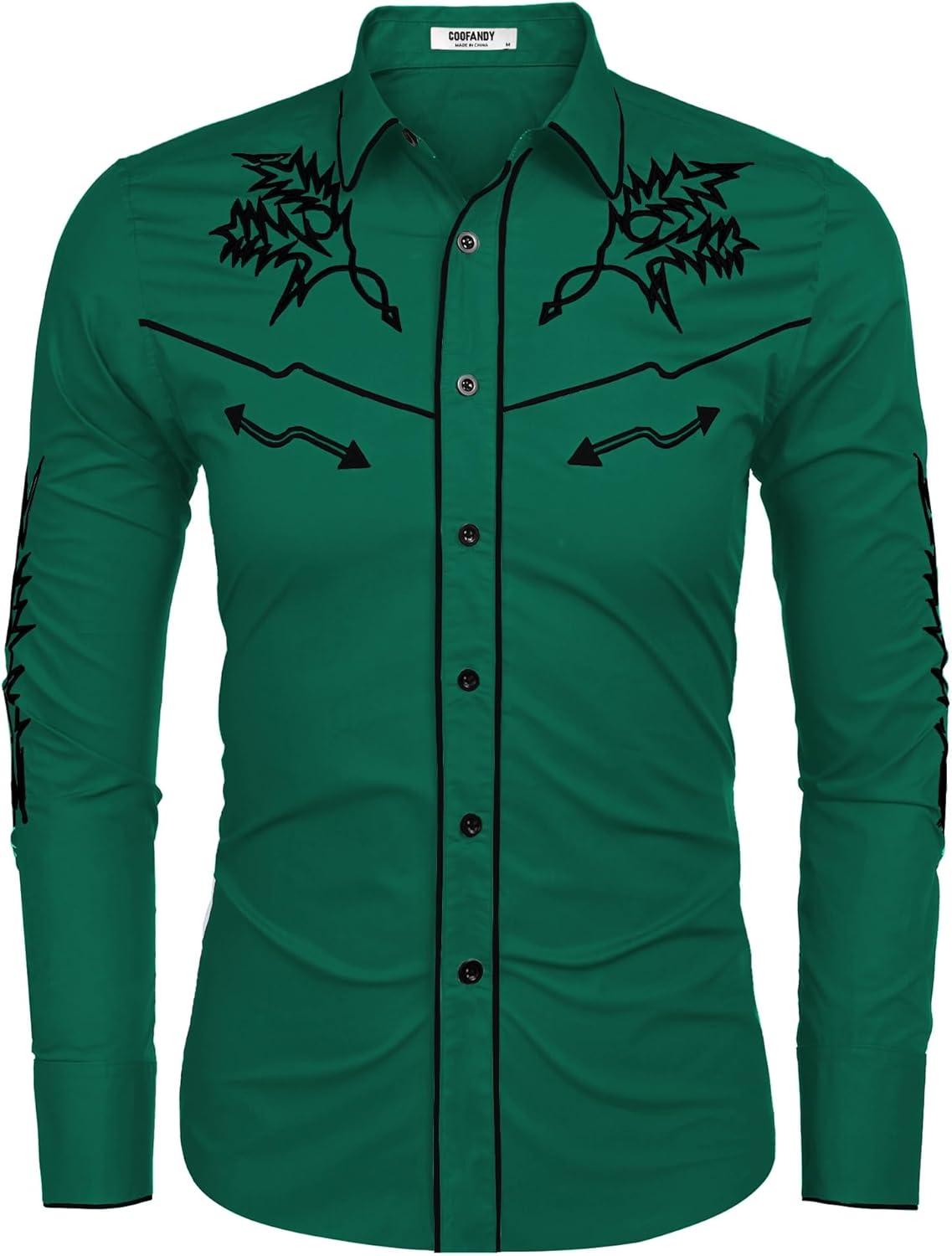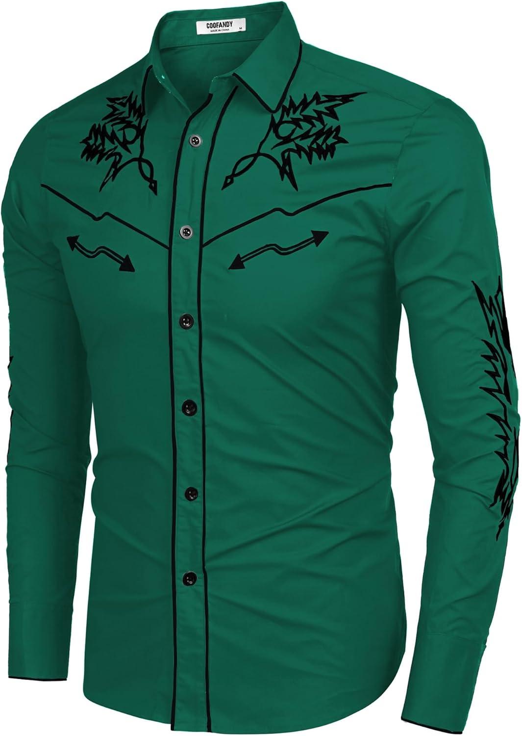 COOFANDY Men’s Western Cowboy Shirt Long Sleeve Embroidered Shirt Slim Fit Cotton Casual Button Down Shirt(Green)