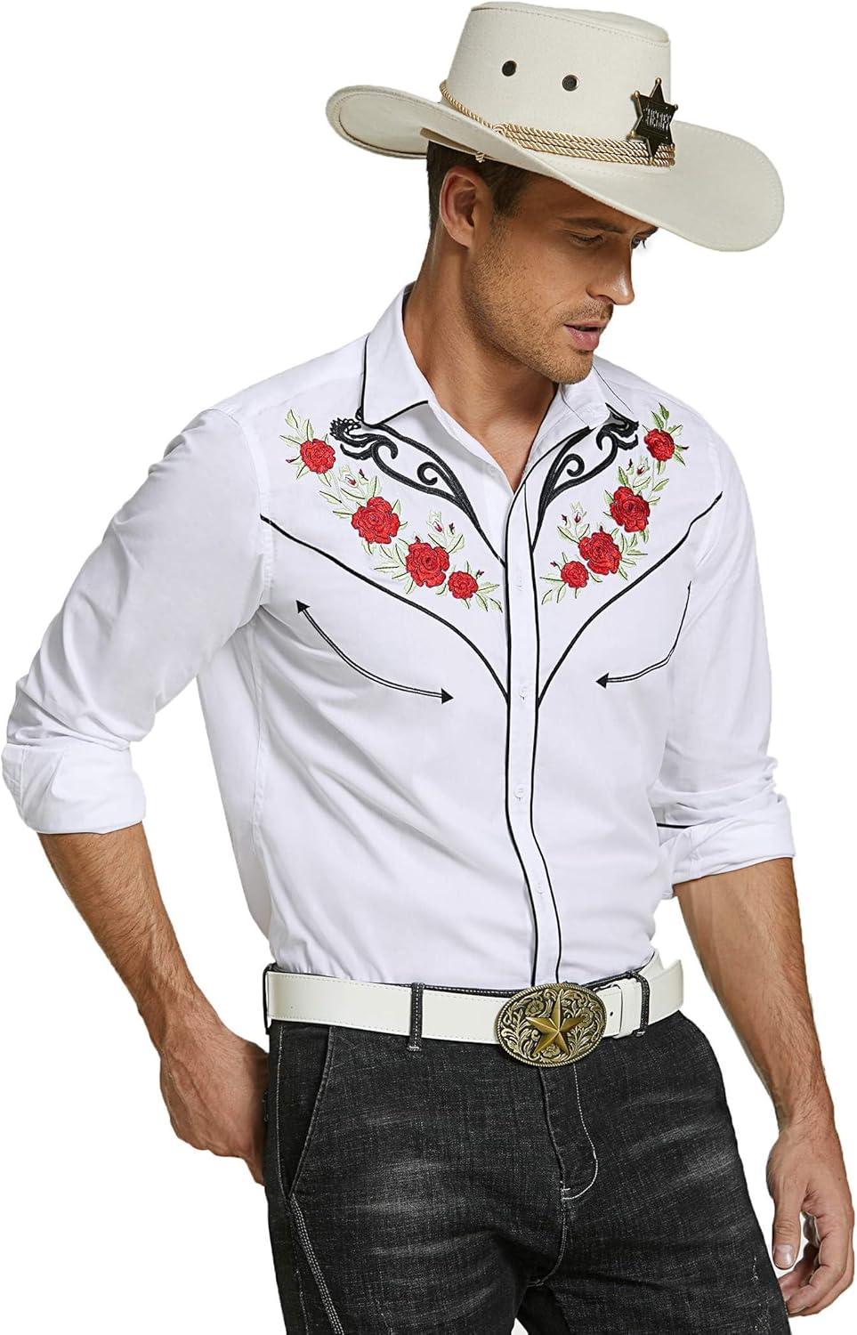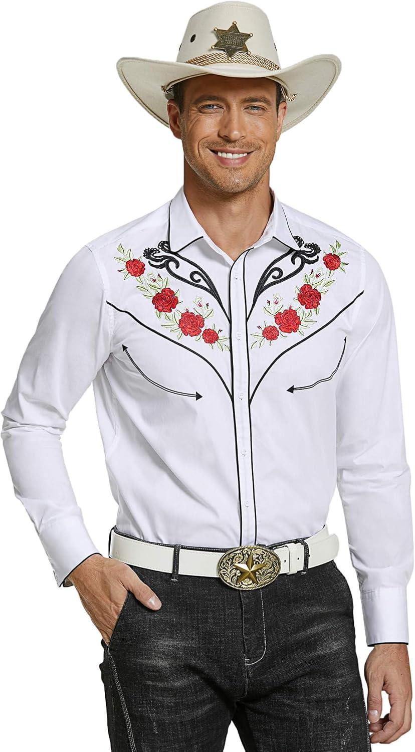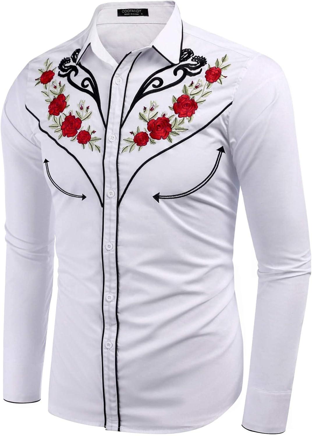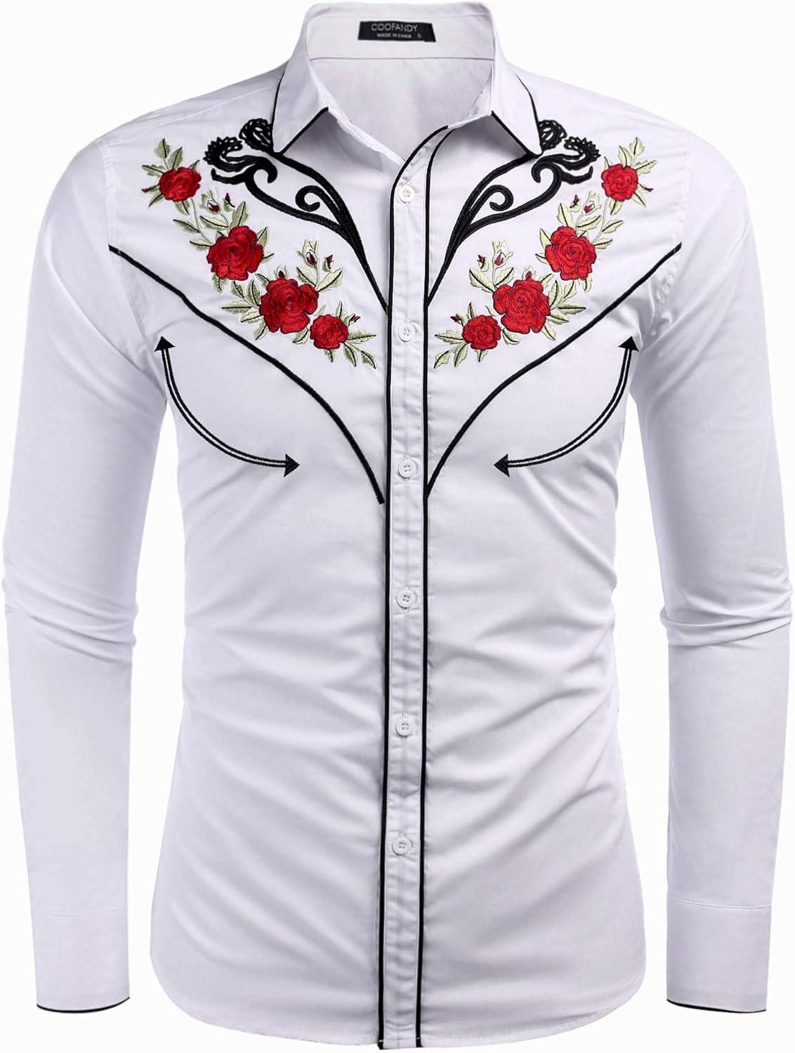 COOFANDY Men’s Western Cowboy Shirt Long Sleeve Embroidered Shirt Slim Fit Cotton Casual Button Down Shirt(White (Retro Rose))